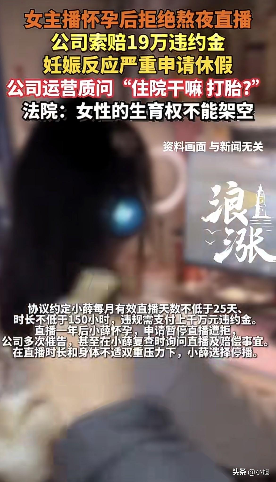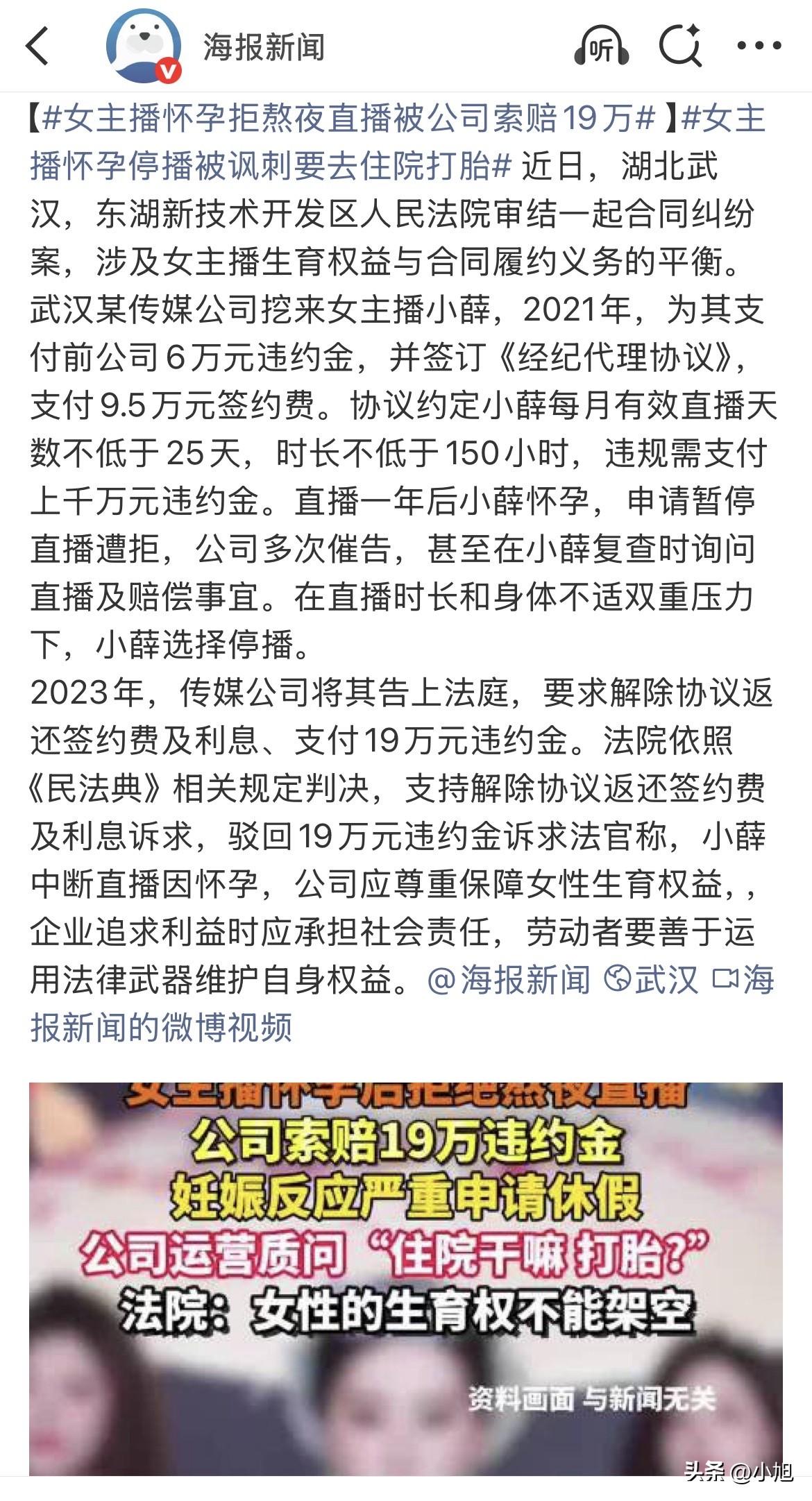 “你住院干嘛?打胎?” 这句话是一个传媒公司运营,发给怀孕女主播的。 不是网友编的,是法庭上出示的聊天记录。 小薛,2021年被武汉这家传媒公司从别处挖过来。公司替她赔了前东家6万违约金,又给了9万5签约费。条件是每个月直播至少150个小时,不低于25天。 她签了合同,开始熬夜打游戏直播。一天五六个小时,还得一直说话互动。 就这么播了一年。 2022年9月,小薛查出怀孕。 孕早期什么感觉?恶心、嗜睡、浑身没劲,闻到味儿都想吐。让她再熬夜打游戏直播,五六个小时坐在那儿,身体根本扛不住。 她去找公司商量,想请个假,或者暂时调低时长。等过了这阵子,身体好点了再补。 公司运营的回复,就是从聊天记录里翻出来的那句话。 “你住院干嘛?打胎?” 还补了一句:“你到底什么情况,是不是想赔钱了?” 小薛大概没想到,自己好好跟公司沟通,换来的会是这种话。 一个孕妇,身体扛不住了,去医院检查。公司第一反应——你是不是去打胎?你不播就是想赖账? 这段对话后来成了法庭上的关键证据。 小薛最后还是停了播。不是不想播,是真的播不动了。孕早期的反应,加上公司运营天天催,她根本撑不住。 2023年,公司把她告了。 诉求两条:让她把9万5签约费退回来,再赔19万违约金。 公司算的是这样一笔账——你签了合同,拿了钱,没播够时长,那就按合同赔钱。合同里写着的,白纸黑字。 开庭的时候,法院翻合同,翻到了一条很有意思的条款。 合同里写着,公司安排工作时,要“充分考虑到乙方的身心状况和劳动强度”。 这条是小薛签合同时就有的。不是她自己加的,是公司合同里本来就写着的。 也就是说,公司自己签的合同都写了,要照顾主播身体。结果人家怀孕了,不舒服了,公司翻脸比翻书还快。 法院最后判了:签约费9万5要退,但19万违约金,驳回。 法官说了一段话:小薛停播是因为怀孕,这是客观原因,不是她主观上想违约。公司那套“要么播要么赔”的逻辑,法院不认。 还有一个细节,法院特意点了出来。 公司起诉要19万违约金,但没有拿出任何证据,证明自己实际损失了19万。 合同里写多少,就真能赔多少?法院不这么看。要赔钱,得拿出真凭实据来。拿不出来,就不认。 另外,法官还提到了一个词:公序良俗。 公司运营那句“你住院干嘛?打胎”,在法院看来,不光是不体谅员工,是直接违背了公序良俗。 合同再大,也不能让这种话变得合理。 小薛这次算是运气好,法院把刀给挡回去了。 但这件事有意思的地方,不光是法院怎么判。 你看时间线:2021年,公司挖她,赔前东家6万,给签约费9万5,出手大方得很。2022年,她怀孕了,公司态度180度转弯。2023年,公司起诉,要她把9万5退回来,再赔19万。 这套操作下来,公司等于白拿了前东家6万,还倒贴了一年多的投入。小薛虽然要退9万5,但好歹没背上19万的债。 可如果法院没挡这把刀呢? 合同上的高额违约金,本质上是悬在主播头上的刀。平时不用,一旦主播不听话,公司就拿这把刀吓人。 小薛的情况是怀孕,有医疗记录,有聊天记录,能证明自己是“客观不能履约”。法院认这个。但如果换一个人,换一种情况呢?比如只是累了、病了、家里有事? 合同上那串数字还在,刀就还在。 还有一个值得琢磨的地方。 小薛停播后,公司起诉前,有没有可能协商解决?比如暂停合同、等她生完再播?或者协商解约、只退签约费不赔违约金? 从聊天记录看,公司运营的沟通方式,直接把这条路堵死了。 “你住院干嘛?打胎?” 这种话一出口,基本上就是告诉你:我们不谈,你播就播,不播就赔钱。 法院最后判她只退签约费,没让赔违约金。等于告诉这类公司:合同不是你这么玩的。 直播行业看着光鲜,月入过万的主播不少。但合同一签,违约金千万的字样写上去,那就是悬在头顶的刀。 不听话了,公司就拿这把刀吓你。 小薛这次算是运气好,法院把刀给挡回去了。 你觉得公司这个操作合理吗? 来源:海报新闻、极目新闻、东湖新技术开发区人民法院