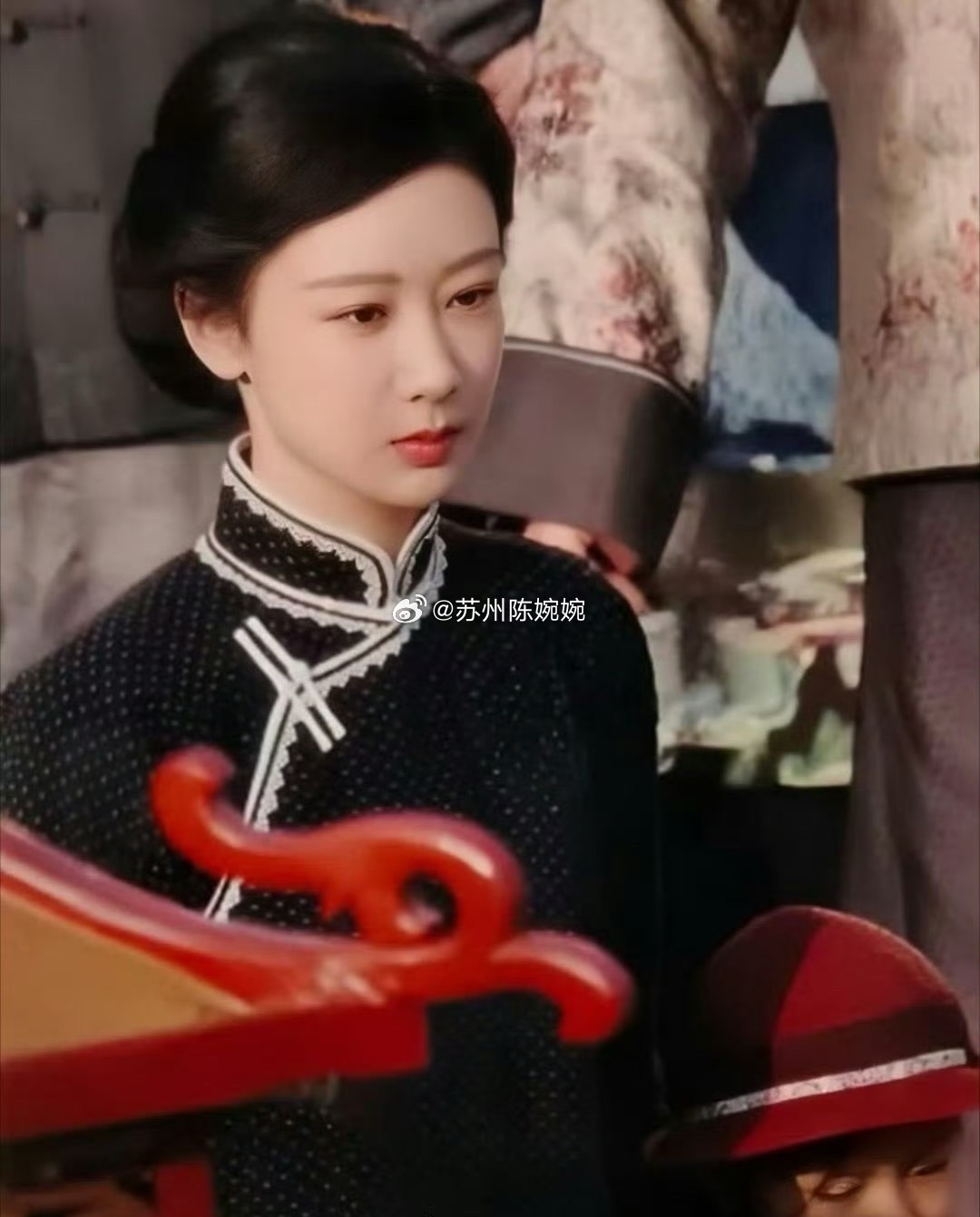 杨紫主演的《玉兰花开君再来》的最新路透妆造图,盘起了头发穿起了民国时期的服装,有