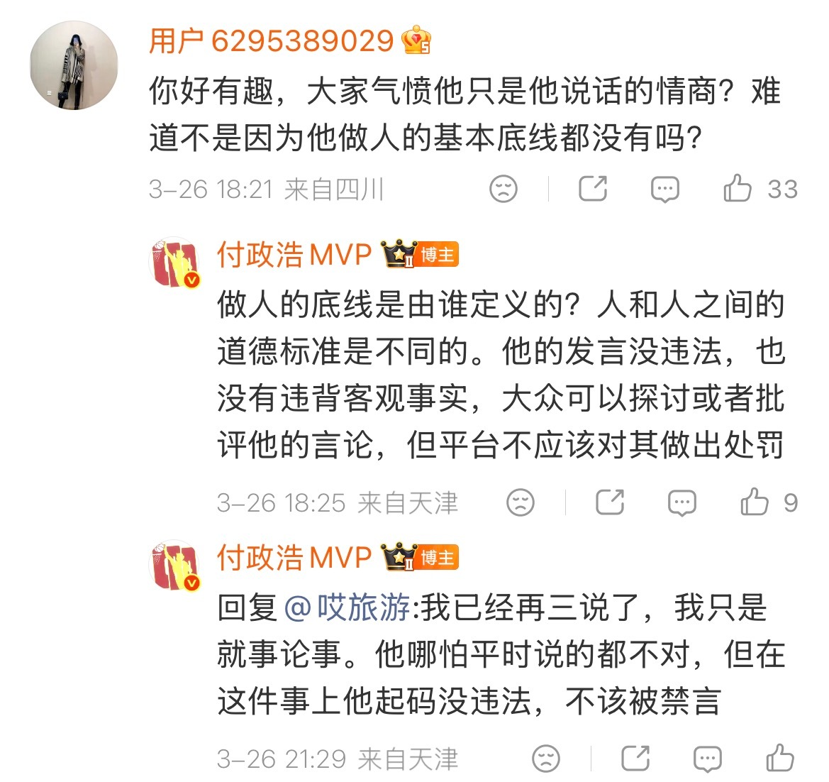 留几手被禁止关注,付政浩誓要捍卫留几手发言的权利,并且强调留几手没犯法。那张雪峰此前一些不恰当言论也被禁止关注是犯法了吗?还是因为张雪峰说的是支持梧桐,你觉得不符合你的价值观?反而留几手暗讽张雪峰去世符合你的价值观?