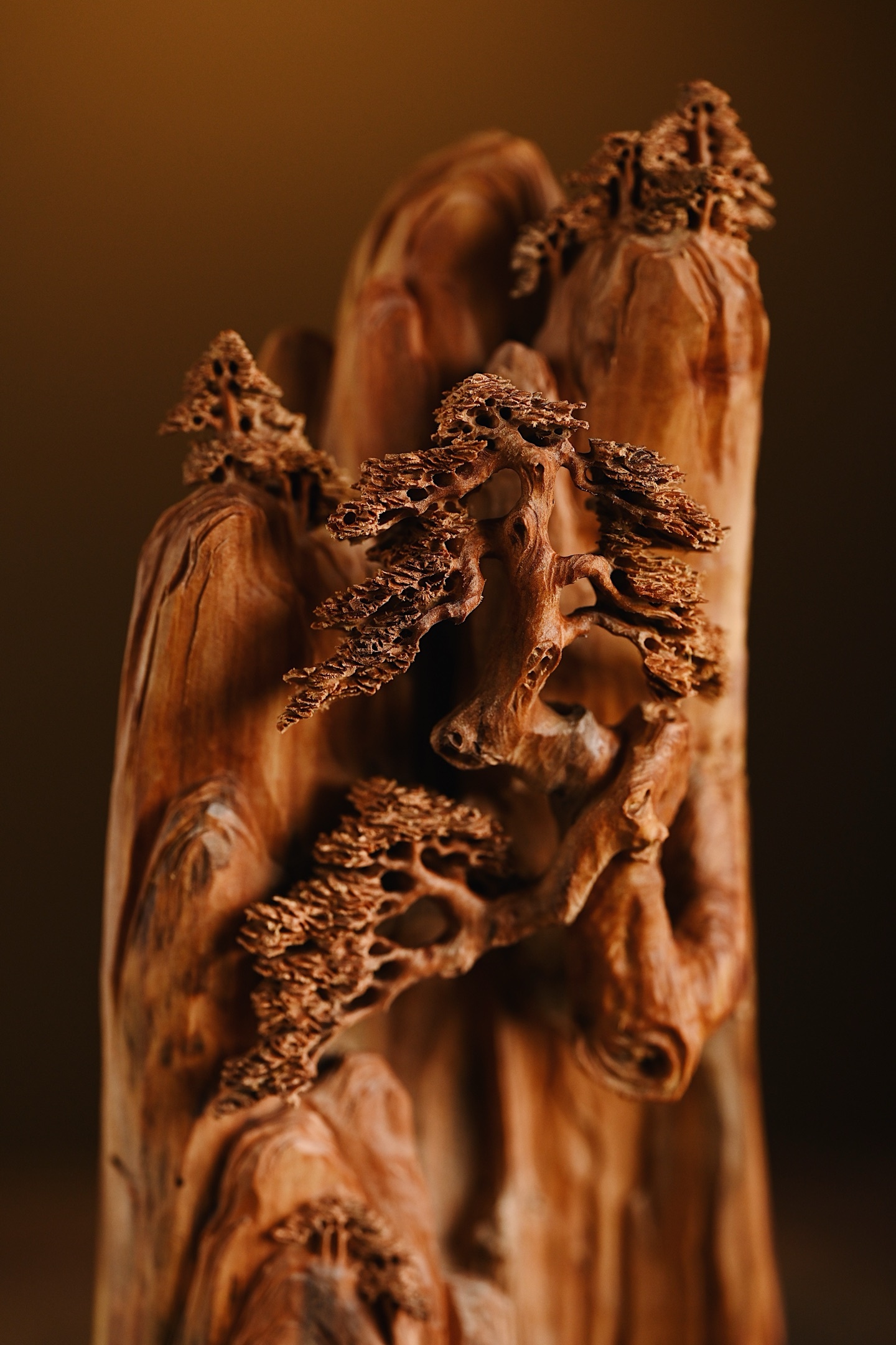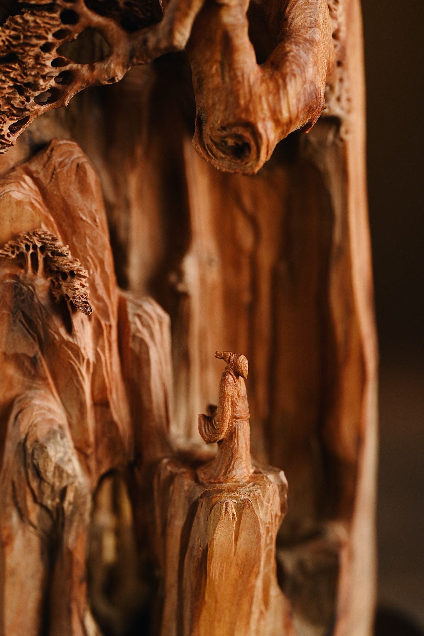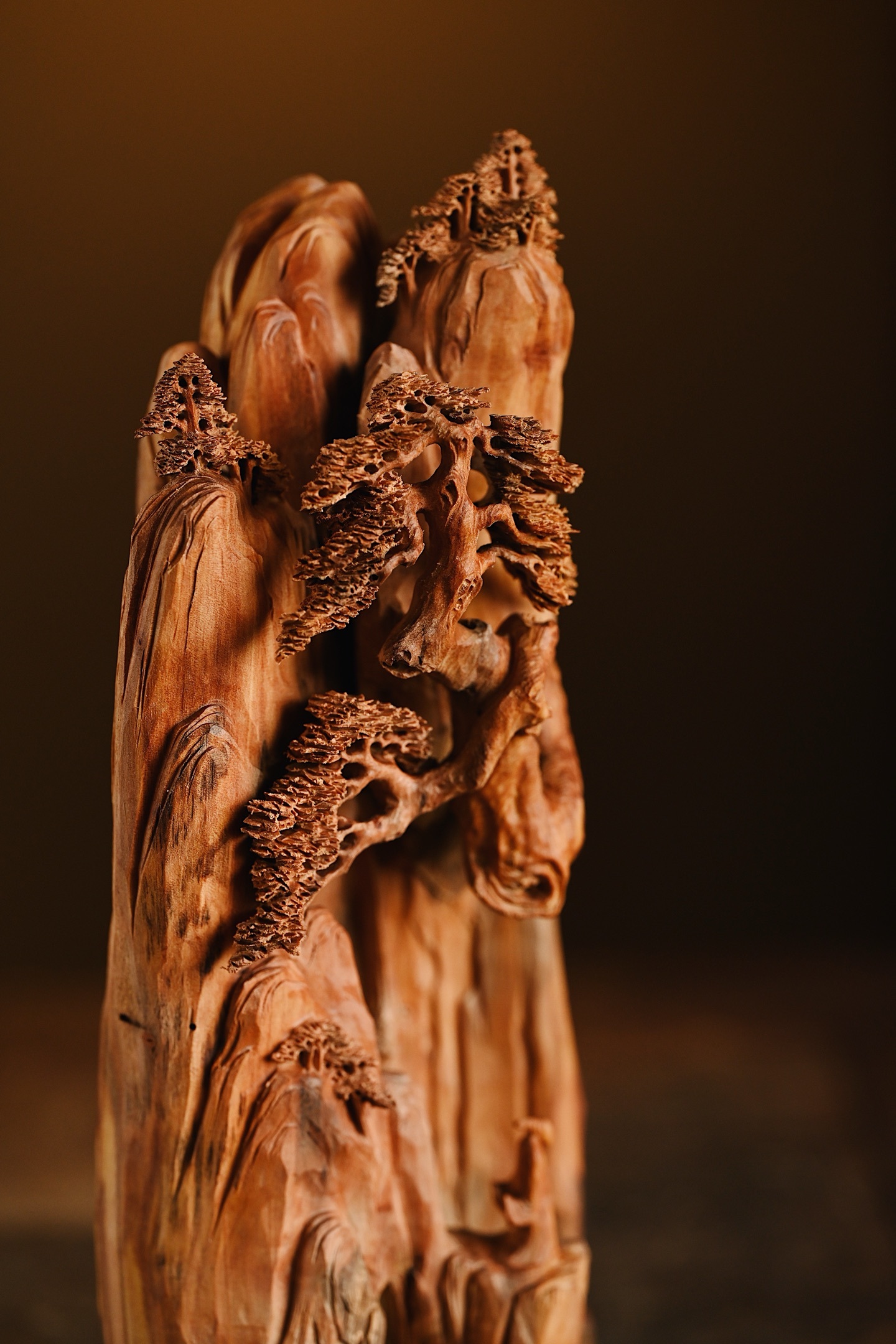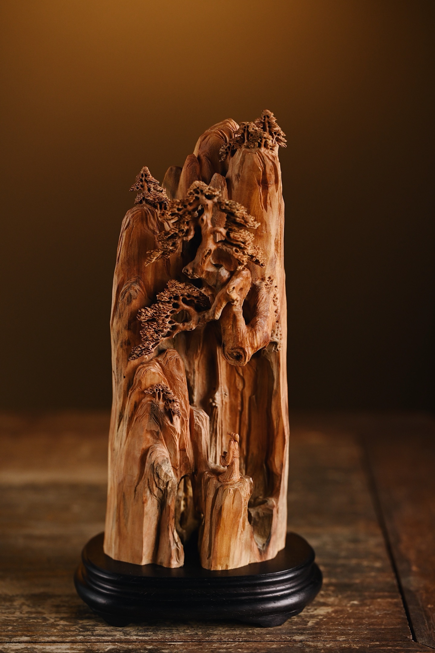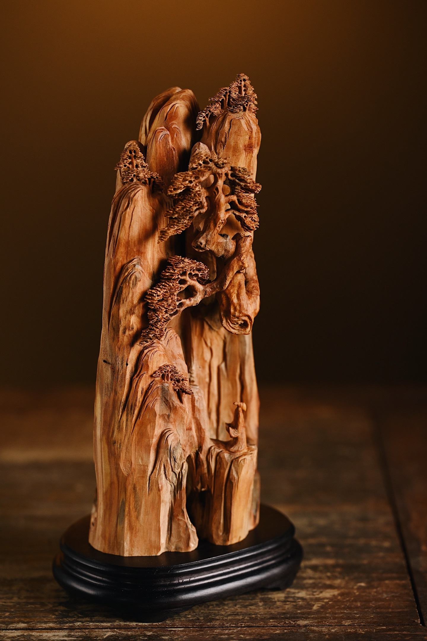 取天然之形,融山水人文之趣。刀笔随木势流转,刻出危崖千仞、古松横斜,更有高士临崖听松,形神兼备。置于案头,如有松风入耳,涤荡尘心。