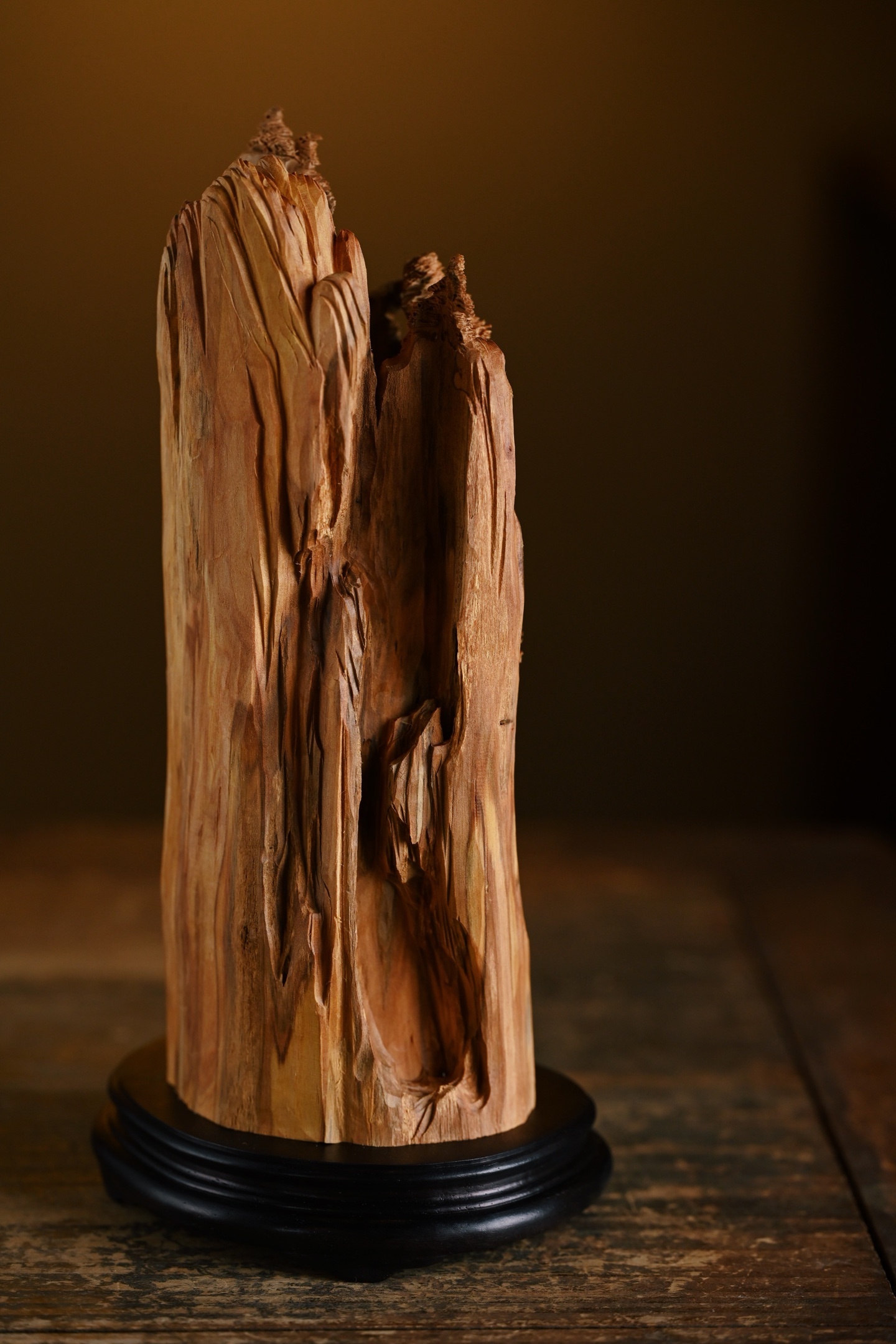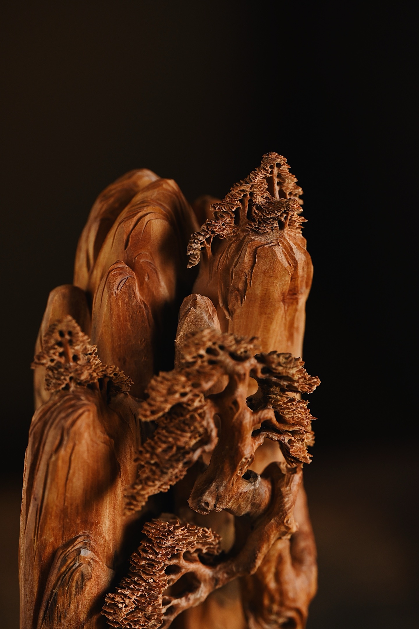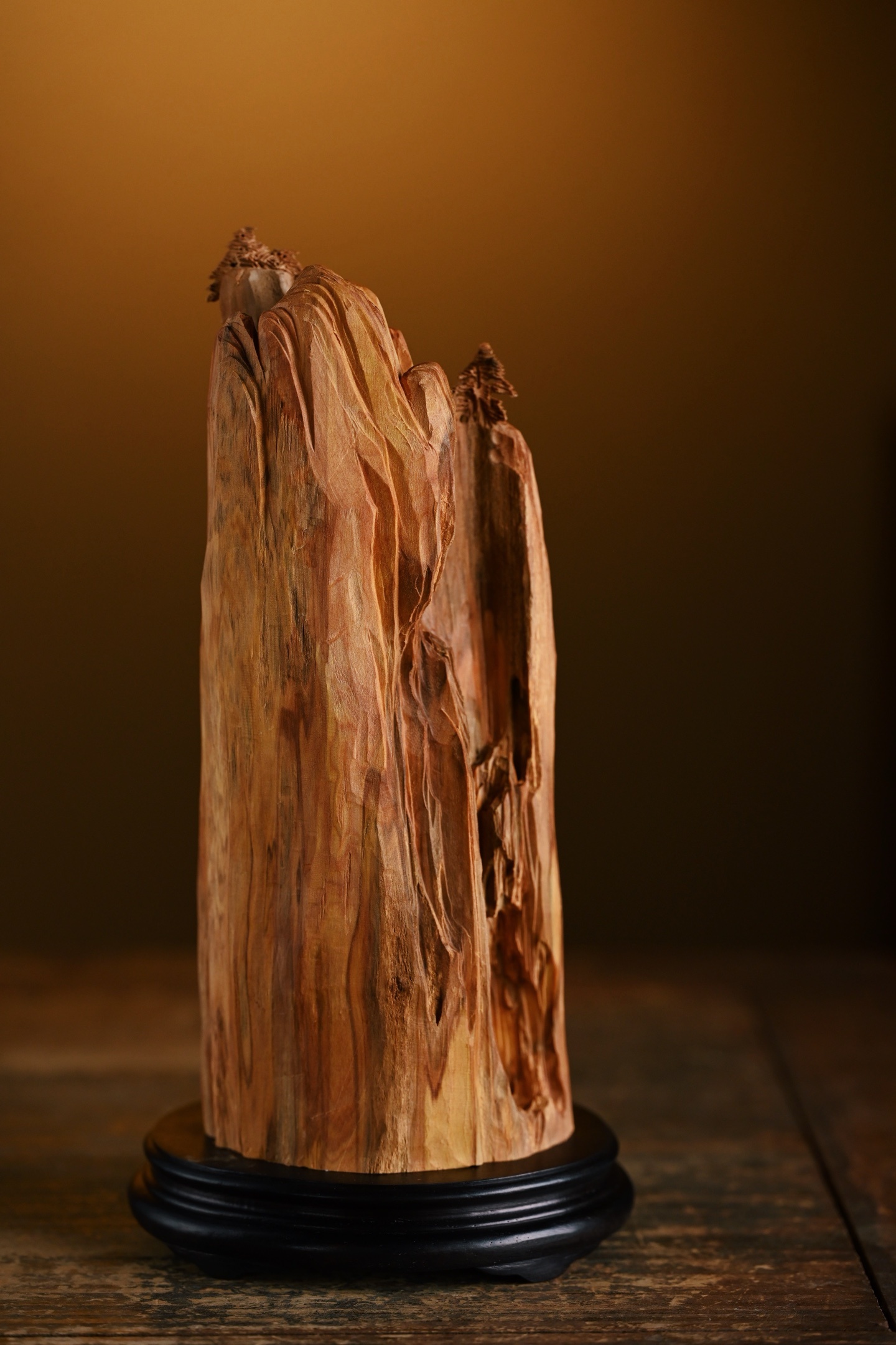 老山檀 | 观山听松 摆件取天然之形,融山水人文之趣。刀笔随木势流转,刻出危崖千