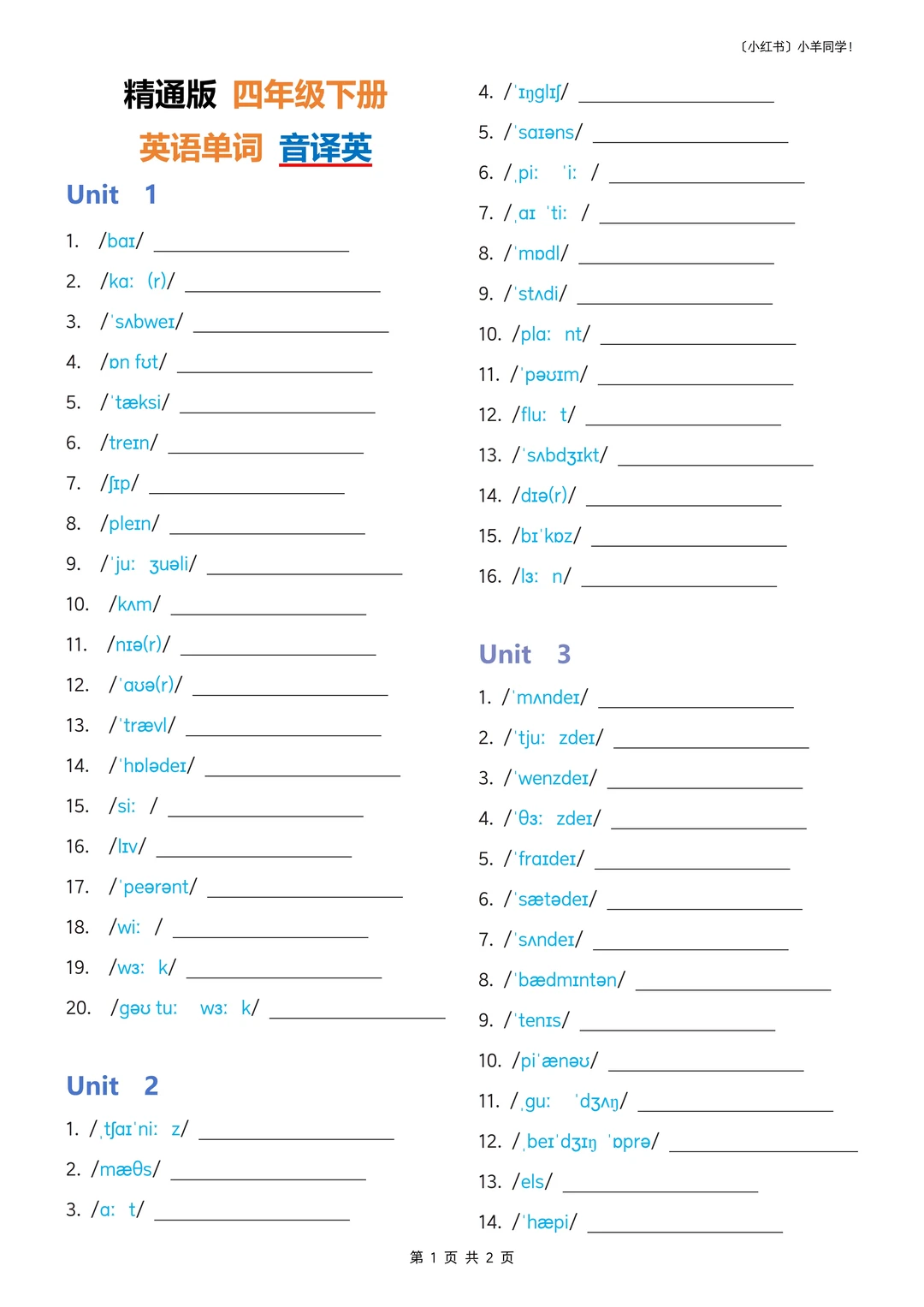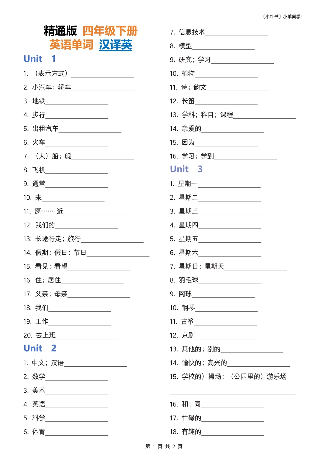 一共五份文件,每个学期都有单词+默写单。 1. 四下英语单词新版 (精通版) 2. 四下英语单词新版 (精通版)— 汉译英 3. 四下英语单词新版 (精通版)— 教材版 4. 四下英语单词新版 (精通版)— 音译英 5. 四下英语单词新版 (精通版)— 英译汉 3-6年级的全部单词和默写单可在评论区店铺获取,无论是提示背诵,还是小升初复习,都非常适合。