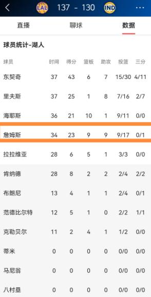 湖人巨星詹姆斯真是太讨厌刷数据了!在昨天湖人客场以137:130战胜步行者的比赛中,詹姆斯再次打出了非常高效的表现,他距离砍下三双仅差1篮板和1助攻。说实话,本场比赛詹姆斯要想砍下三双简直易如反掌,但是詹姆斯天生就讨厌刷数据,所以詹姆斯为了球队的利益甘愿牺牲自己的数据。 北京时间3月26日,NBA常规赛迎来一场焦点对决,洛杉矶湖人客场作战,最终以137比130击败印第安纳步行者,拿下这场胜利稳住球队战绩。   本场比赛湖人多名球员发挥出色,而詹姆斯的表现依旧稳定全面,交出了一份亮眼且务实的数据单,也打破了外界针对他的一些不实质疑。   整场比赛,詹姆斯首发出战34分钟左右,出手选择十分合理,全场17投9中,三分线外1次出手未能命中,罚球线上5罚全中,稳稳拿下23分,同时摘下9个篮板,送出9次助攻,还有1次抢断入账。   单看这份数据就能看出,詹姆斯的进攻效率不低,既能自己得分终结进攻,也能盘活队友,同时在防守端也有贡献,全程都在贴合球队的节奏打球,没有盲目出手占用球权。   细心看数据就能发现,詹姆斯距离三双只差1个篮板和1次助攻,以他的赛场能力和球权支配度,想要凑齐这两个数据并不算难。   比赛后半段,湖人一直占据着场上主动权,比分始终保持领先,胜负悬念没有彻底消失,但也没有到胶着到难以掌控的地步。   这种局面下,詹姆斯没有刻意去争抢篮板、强行组织进攻去刷三双,而是按照球队的战术安排,做好自己的本职工作,把精力放在稳住局势、配合队友跑位上,确保球队稳稳收下这场胜利。   说白了,职业赛场到了詹姆斯这个级别,个人数据的积累早已不是核心追求,球队赢球、稳住常规赛排名、为后续的季后赛蓄力,才是更重要的事。   三双数据固然好看,但对于志在冲冠的湖人来说,一场客场胜利的价值,远大于一名球员的个人数据荣誉。   詹姆斯很清楚这一点,所以他没有为了凑齐三双去改变自己的打球方式,没有为了个人数据打乱球队的战术部署,而是甘愿留在合适的位置上,做好攻防两端的细节,助力球队取胜。   一直以来,总有部分声音质疑詹姆斯刻意刷数据,甚至拿他的赛场表现无端抹黑,但这场比赛的表现足以说明问题。   真正看比赛的人都能看出来,詹姆斯的每一次出手、每一次传球、每一次卡位抢篮板,都是围绕球队的进攻和防守展开,没有刻意为了数据去做多余的动作。   他的出场时间、出手次数,都是教练组战术安排的结果,整场打的高效且务实,没有浪费任何一次进攻机会,也没有拖累球队的防守节奏。   这场比赛湖人能拿下胜利,离不开东契奇砍下43分的强势得分表现,也离不开里夫斯、海斯等球员的给力发挥,詹姆斯则用自己全面且克制的表现,成为球队赢球的稳固基石。   他没有执着于个人数据的完美,而是把球队利益放在首位,用最合理的方式帮助球队稳住局面,这才是老将在赛场该有的作用。   评判一名球员是否在乎数据,不能只看纸面数据的高低,更要看他在场上的选择和举动。   詹姆斯本场差一点达成三双却没有刻意去刷,恰恰说明他的赛场重心始终在球队身上,那些污蔑他是数据刷子的言论,根本站不住脚。   职业赛场靠实力和表现说话,这场比赛的发挥,就是对无端质疑最好的回应。   以上都是个人观点,对此您有什么不同的看法,可以在评论区留言讨论!!!