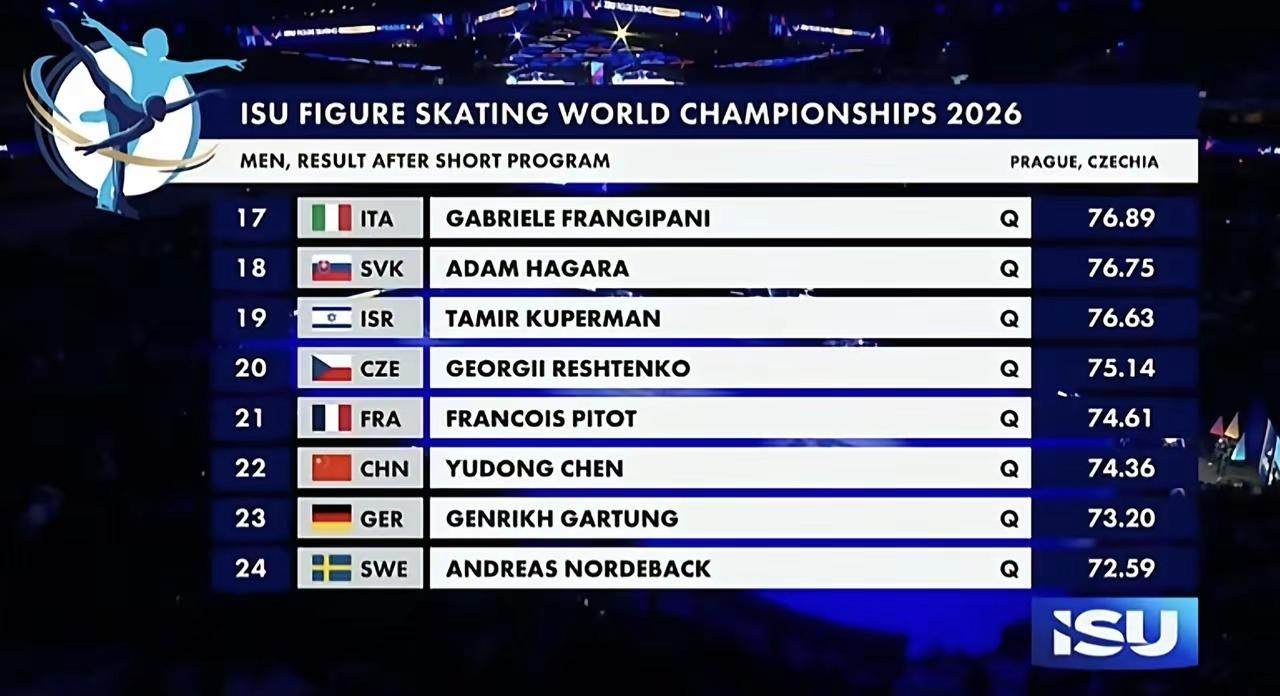 3月26日,2026年花样滑冰世锦赛开幕。 在男子单人滑短节目的比赛中,美国名将马里宁短节目拿出双四+3A的顶级配置,最终拿到111.29的赛季最佳分高居榜首。法国华裔名将萧传文今天同样上双四+3A的配置,拿到101.85分排名第二。爱沙尼亚选手塞勒夫以96.49位居第三。 中国选手陈昱东,开场的四周跳+三周连跳十分惊艳,除了3A落冰略有瑕疵,其余步法和旋转都是满级,以74.36分的成绩位列第22位,晋级自由滑。