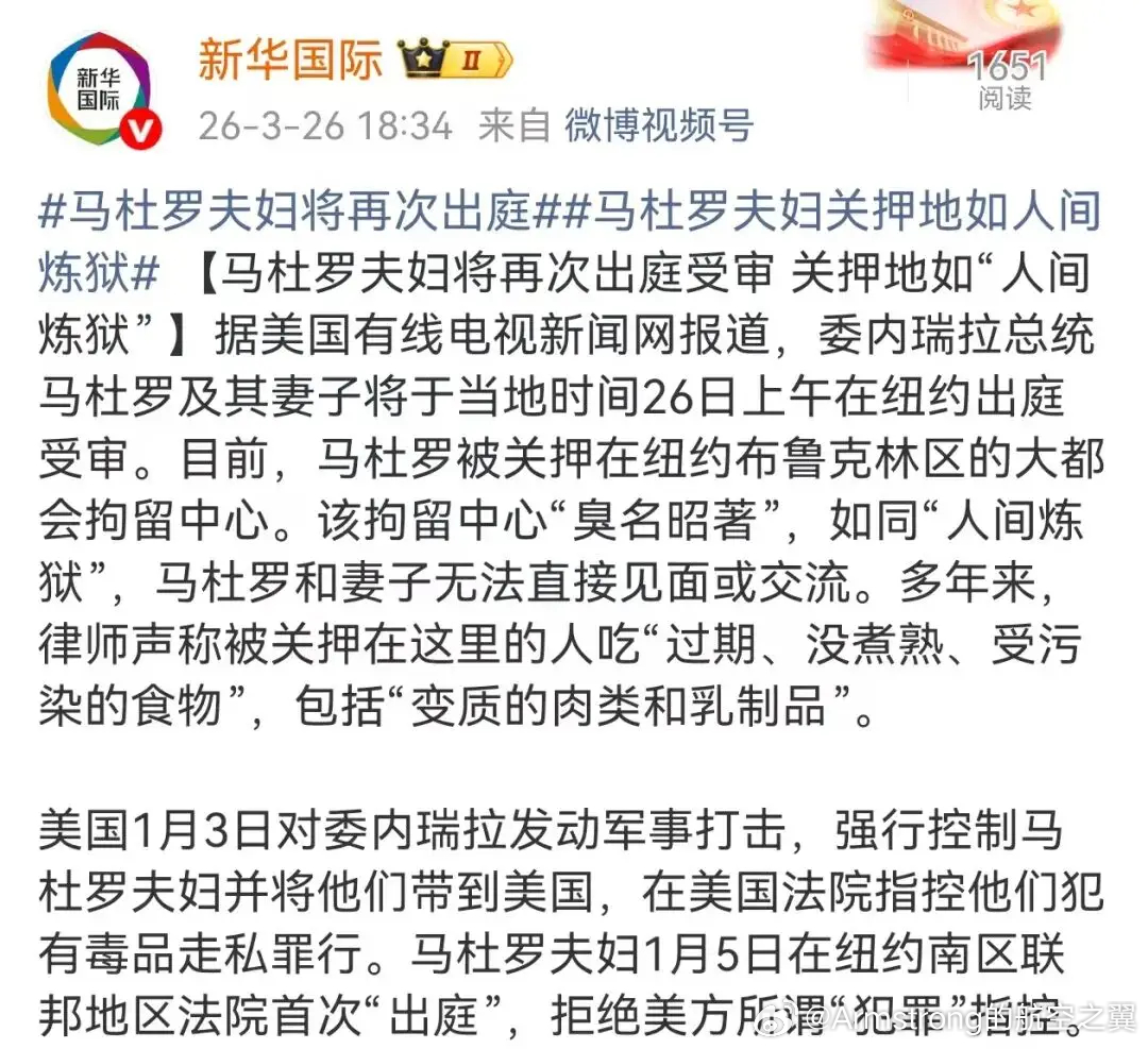 当地时间3月26日上午,马杜罗夫妇再次在纽约出庭受审。马杜罗坚持认为自己是“战争罪犯”和被“绑架”的合法元首。