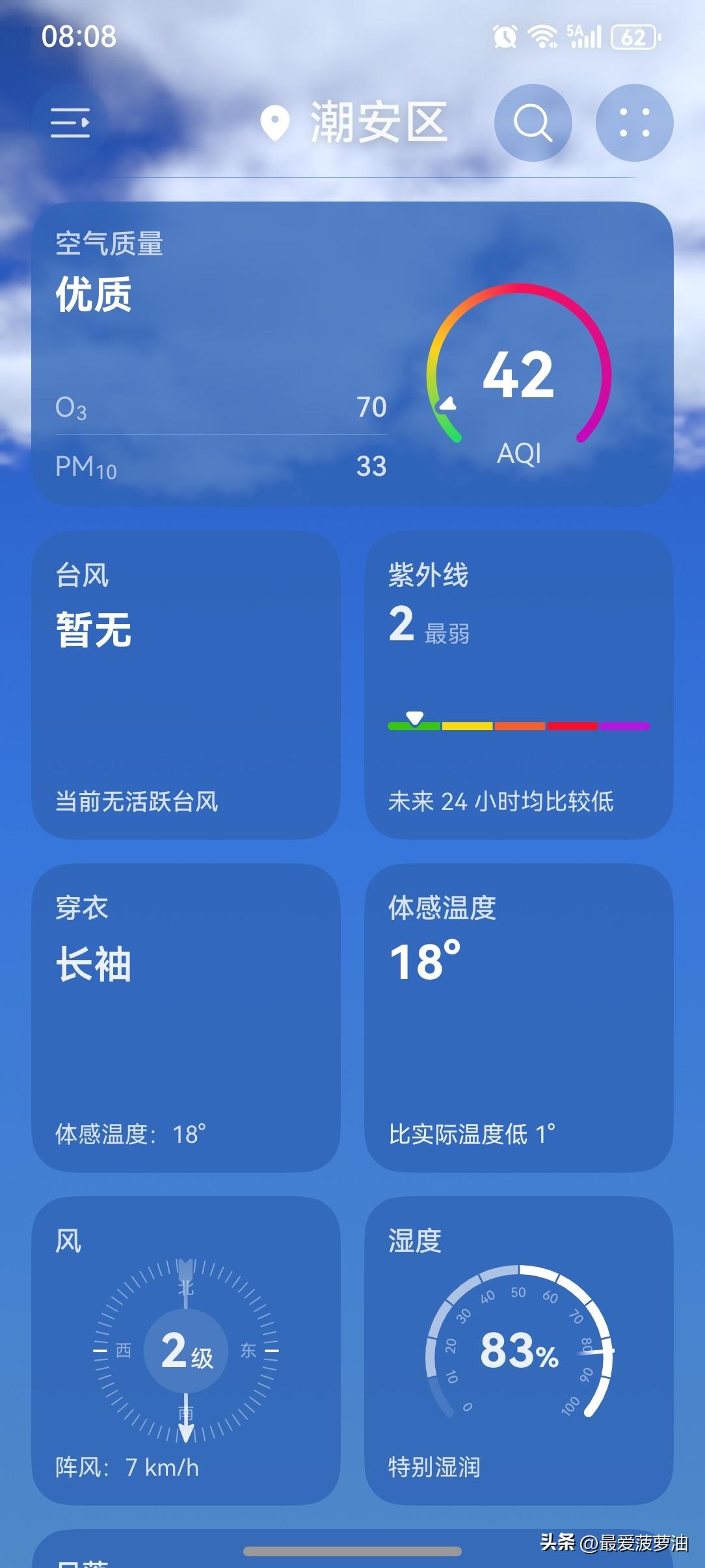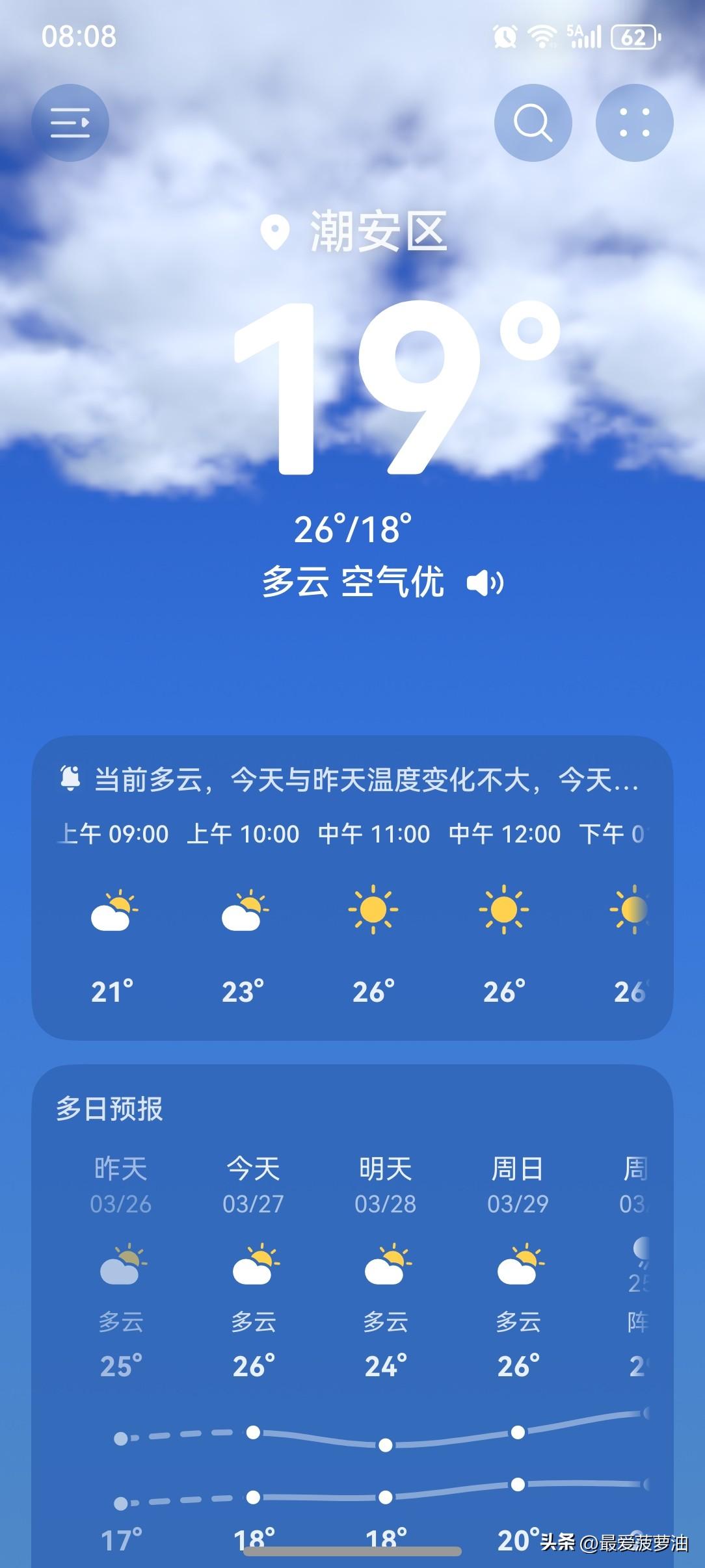 晾晒余额不足!广东即将迎来强对流天气! 27日开始,我省降水将趋于频密,雨势趋于明显,雨雾时能见度偏低,其中27~29日韶关、清远、肇庆北部、河源北部和梅州北部市县有中(雷)雨局部大雨或暴雨。另外,29日前后西北部的部分市县雷雨时伴有短时强降水、8级左右雷雨大风和冰雹。 今天(27日),潮州喜提一个多云天气,气温17~26℃,此刻气温19℃,体感温度18℃。 一起来看看今天的天空吧!云量依然有点多,看不到一点阳光。 早上的气温倒是比较昨天暖和了许多,没有雨,也没有风…… 这天气,虽然是阴天,但也不能算不好吧! 从整体来讲,依然值得拥有一个好评吧!如果能够来点阳光的话,那这个好评就必须是五星的。 如此天气!元芳,你怎么看? [我想静静][捂脸][大笑][笑哭][我想静静][捂脸][大笑][笑哭]