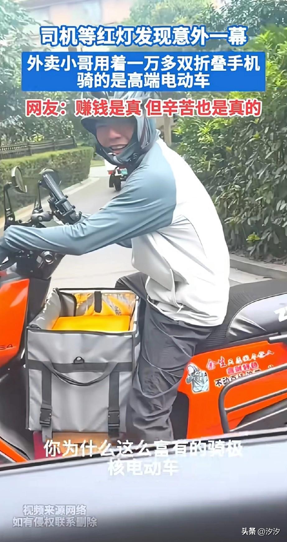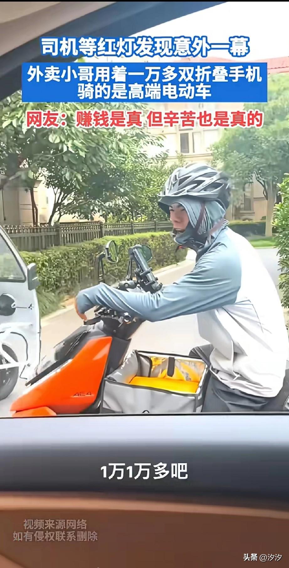 司机等红灯的时候, 发现旁边的外卖小哥, 居然用的是折叠屏手机, 于是问小哥多少钱买的? 老哥说大概11000吧, 这话直接把司机震惊了, 然后问小哥外卖这么挣钱吗? 外卖小哥说用折叠屏手机, 骑高端电动车, 可以走上人生巅峰, 还说赚钱是真赚钱, 但累也是真的累, 司机调侃小哥是来体验生活的, 随后小哥就骑车离开了, 大城市送外卖这么挣钱吗? 大家觉得外卖小哥厉害吗? 外卖手机 京东折叠屏 折叠送餐车