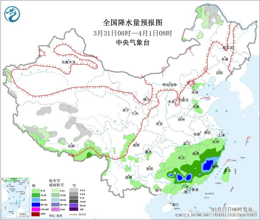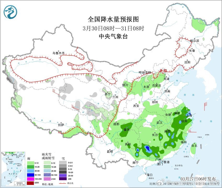 预计3月27日08时至28日08时,西藏南部、甘肃河西等地局地有大雪(5~8毫米)。西藏东南部、重庆西部、贵州东部和南部、湖南西部和南部、江西南部、广西北部、广东北部、福建南部等地部分地区有中到大雨,其中,湖南西南部、广西东北部、江西南部等地局地有暴雨(50~70毫米)。