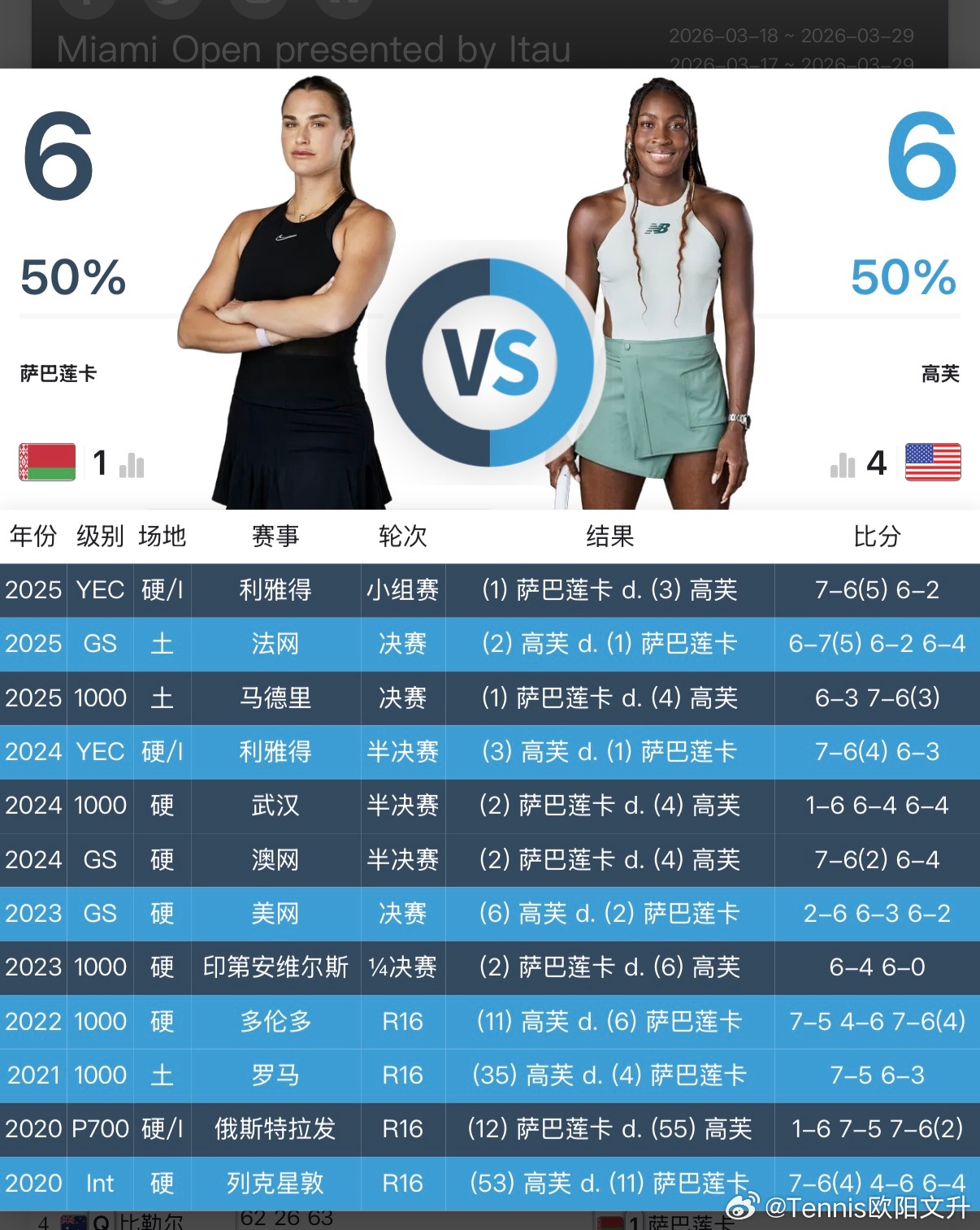 🔵WTA1000迈阿密女单决赛对阵🇧🇾萨巴伦卡vs🇺🇸高芙交手记录6-