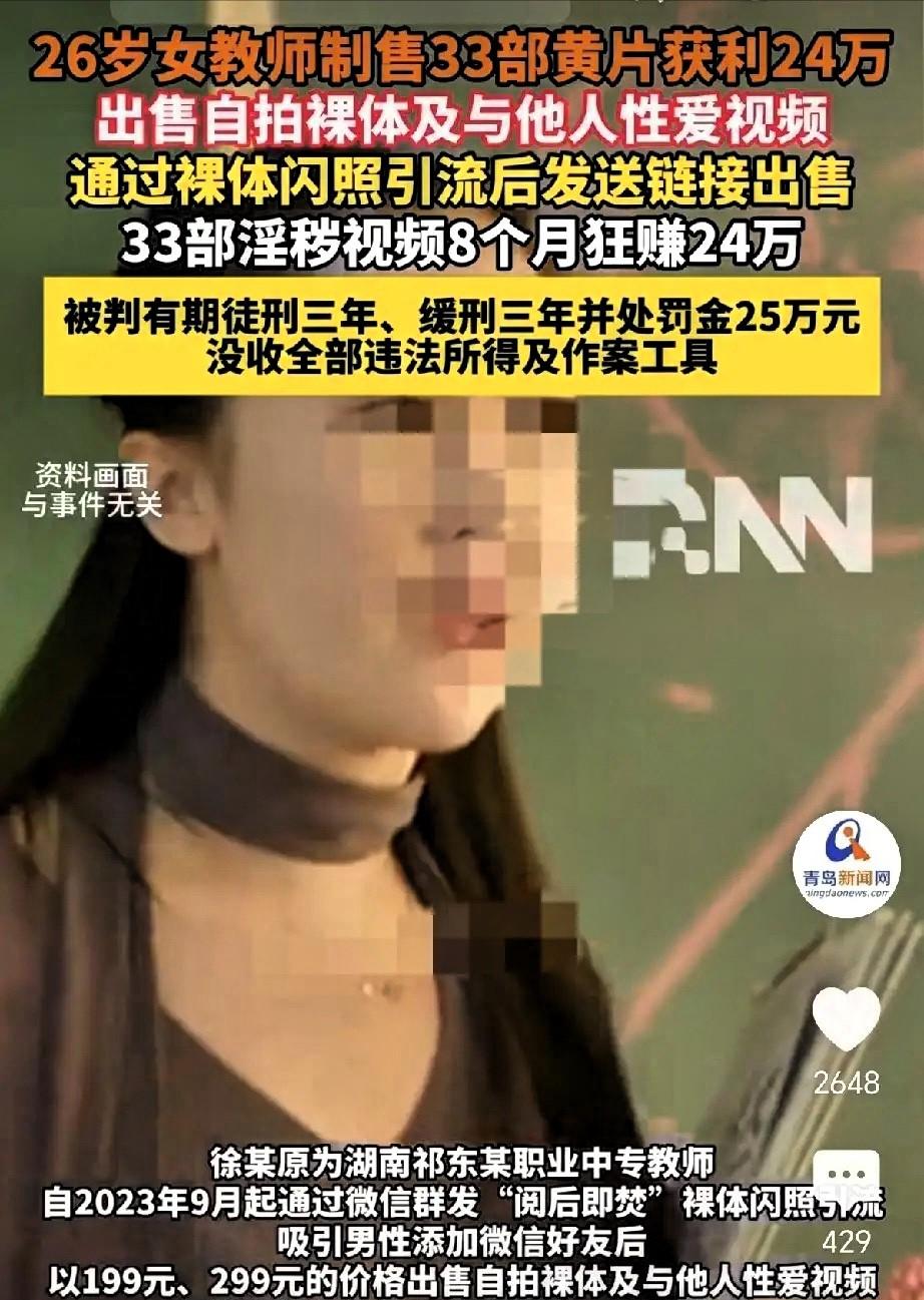 湖南祁东,一女教师嫌收入太低,为了挣钱,自己拍自己,她做成闪照发到群里,一些男子加她为好友,之后她把自己的各种视频,还有和其他男子拍的视频,以199元,299元的价格打包出售,一共卖了33部,挣了24万,可没想到,结果令她始料未及。 26岁的徐某被戴上手铐那天,手机屏幕还停留在备课软件的页面。 屏幕这头是深夜转账记录,那头是明天要讲的教案。 短短八月时光,产出三十三部视频,竟斩获二十四万之财。这般成果,着实令人惊叹,亦彰显出非凡的创造力与执行力。最后换来3年缓刑、25万罚金,还有一张永久作废的教师资格证。 徐某1998年生,本科毕业后端上了小县城里人人羡慕的"铁饭碗"。月薪三千出头,够花,但也仅仅是够花。 真正让她心态崩塌的,是朋友圈里那些成绩不如她的老同学——晒名牌包、网红餐厅打卡、开新车兜风。她站在讲台上攒两个月工资才能买套像样的化妆品,别人拍段视频几分钟就搞定。 白天握粉笔写板书,晚上锁门拉窗帘对着镜头。第一张照片发出去时手抖得厉害,但转账速度快得像点外卖——几十块、上百块,眼皮都不眨。 她很快摸清了门道:把照片做成"阅后即焚"的闪照甩进本地群,几个男的立刻加好友。接着升级到视频,甚至把和别的男人拍的私密画面打包卖。199块入门,299块"全家桶",阶梯定价抓住了购买者的猎奇心理。 多巴胺覆盖了恐惧。她以为不露脸、几秒消失就等于安全,以为躲在屏幕后面就能神不知鬼不觉。 但互联网从来没有真正的匿名。 2024年初,有人买了她的视频后转手传播,群里有人认出她,截图、议论、举报一路告到学校。5月31日,上海警方在她的出租屋里把她带走。手机里的视频、微信转账记录、支付宝收款明细,全都成了铁证。 刑法第363条写得很清楚:以牟利为目的传播淫秽物品,赚1万以上就构成犯罪,赚5万以上或数量达标5倍就是"情节严重"。 之所以能缓刑,是因为她认罪态度好,全额退赃,还主动交了25万罚金,提供关键线索帮警方破案。 更要命的是,祁东县教育局撤销了她的教师资格。那个曾经的"铁饭碗"碎得稀烂,余生都无法再站上讲台。 很多人说她"想钱想疯了"。其实她缺的不是钱,是"别人有我也要有"的攀比心,是"凭什么我这么辛苦却挣得少"的不甘心。 社交媒体天天鼓吹走捷径才叫"人间清醒",仿佛按部就班就是"一眼望到头的平庸"。 家长把孩子交给你,社会把教书育人的责任交给你,不是让你下课去拍那些东西的。她站在镜头前出卖自尊时,不仅出卖了自己,还出卖了学生对社会的最初信任。 被抓那天她还在备课,仿佛下一秒就能回到"正常轨道"。但那部手机上的转账记录,早就给她的人生按下了"注销键"。 24万的收入,25万的罚金,26岁的年纪,余生的体面全丢了。 欲望大过才干,捷径蒙蔽双眼,摔下悬崖只是迟早的事。 信息来源:青岛新闻网
