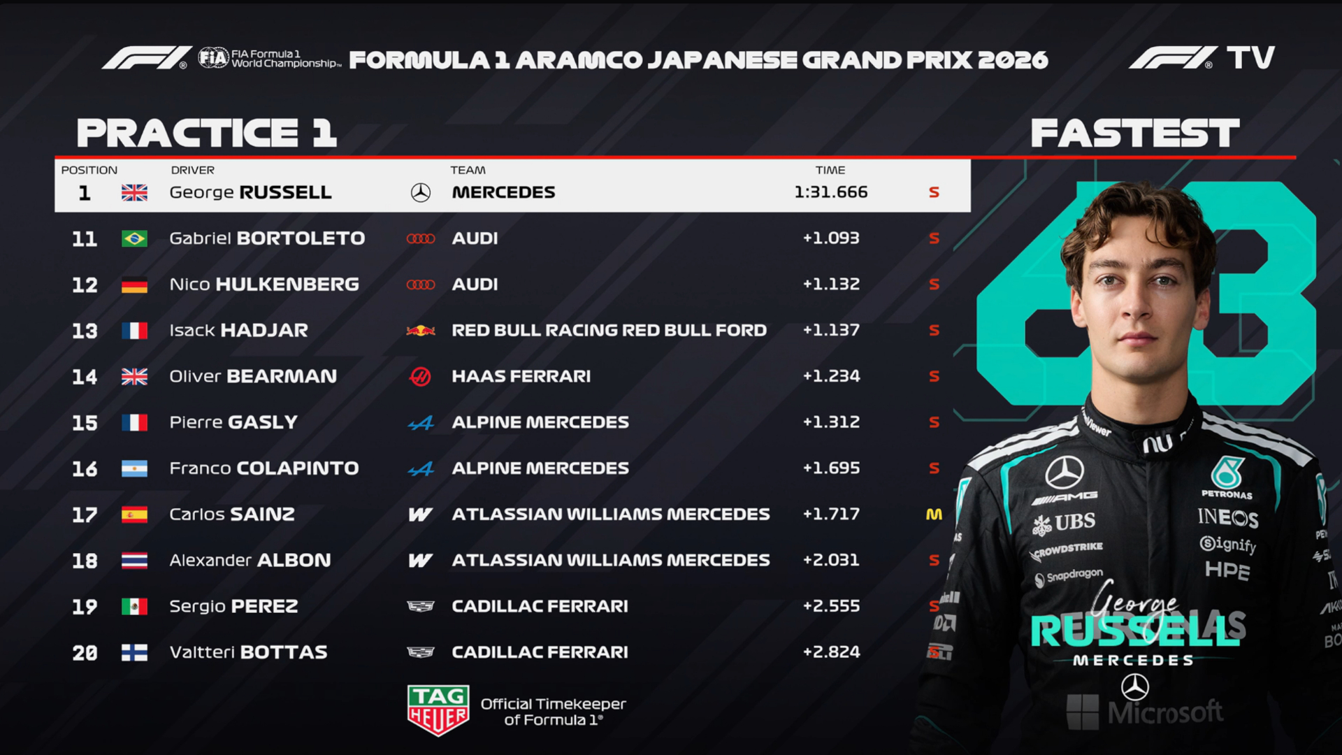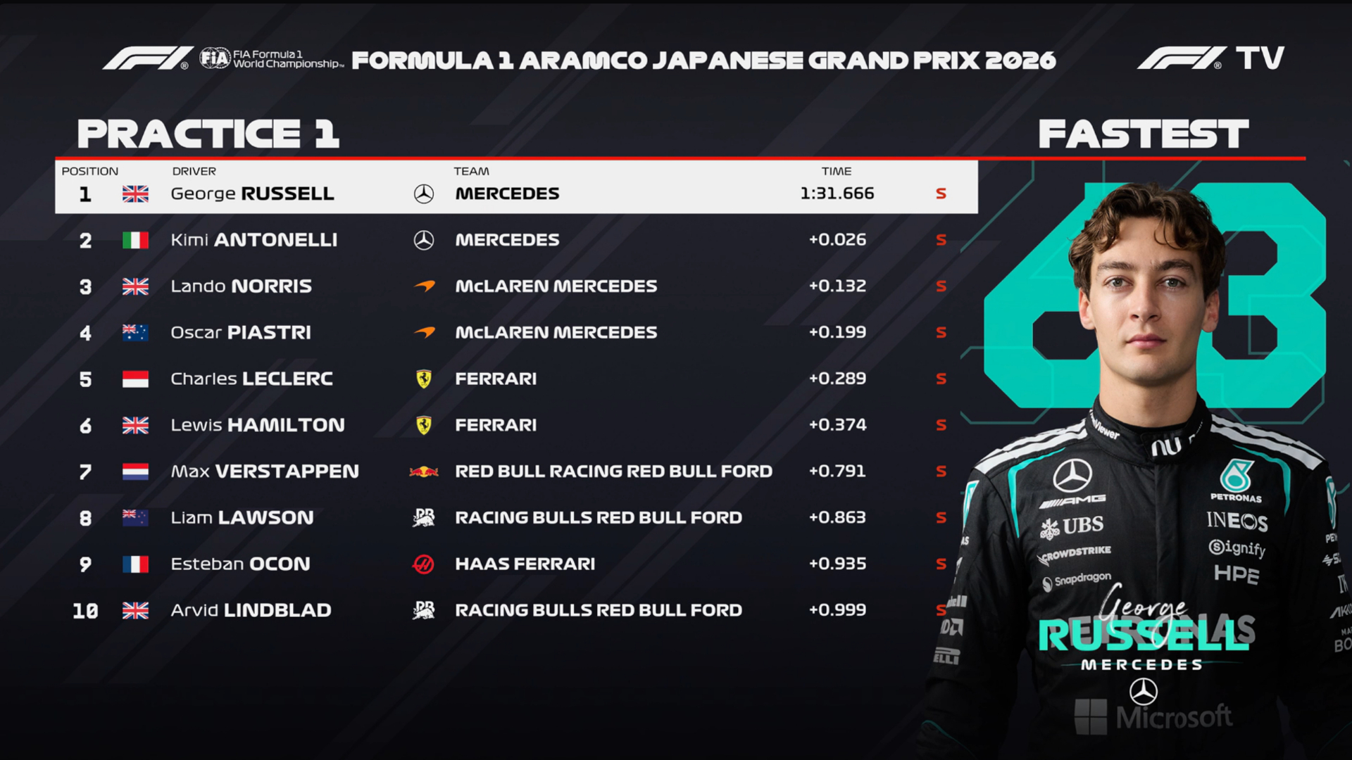 F1日本大奖赛FP1成绩:梅赛德斯1-2,迈凯伦3-4,法拉利5-6F12026