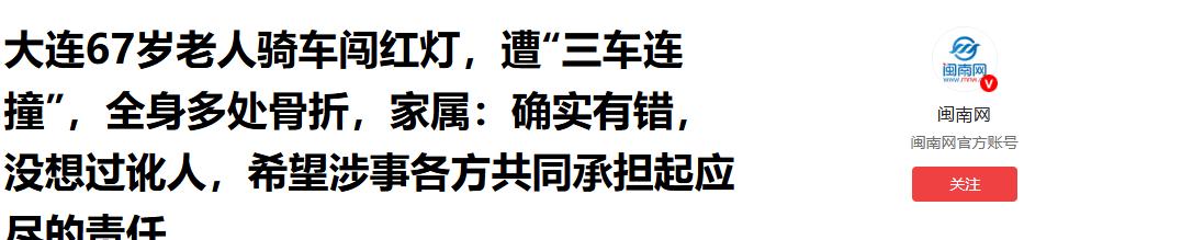 太离谱了!大连67岁大爷连闯红灯,惨遭三辆车连撞,身体多处骨折!视频拍下事情的全过程,大爷闯红灯在先。没想到,大爷家属语出惊人:没想过讹人,希望涉事各方能够积极配合,共同承担起应尽的责任! 3月1日中午,大连中华路与月牙泉路交汇处。绿灯亮起,车流正常涌动。潘大爷却骑着车,视若无睹地连闯红灯。 12点整,第一起碰撞发生。大爷在里侧车道与一辆SUV相撞倒地。SUV司机下车交涉了几句,随后驾车离开。这看似普通的剐蹭,却推倒了多米诺骨牌的第一张。 大爷起身继续骑行。可仅仅过了一分钟,远处驶来的白色轿车避让不及,直接将他撞飞。零件碎了一地,大爷这次没能站起来。危险,正在向这个倒地的老人逼近。 12点03分,最惨烈的一幕上演。过往车辆都在绕行,一辆黑色SUV却在绕行时不慎压到了老人的下半身。短短四分钟,三度遭重创。 大爷伤得极重。股骨粉碎性骨折,耻骨、腰椎、肋骨等多处断裂。大连理工大学附属第三人民医院的手术室里,医生全力抢救。截至3月24日,医疗费已经逼近7万元大关。 记者在医院见到了老人的女儿潘女士。面对巨额账单,家属没有一哭二闹。她坦言父亲闯红灯确实有错,愿意承担责任,并反复强调绝没想过借此讹人。 这种放低姿态的做法,其实是一种极高明的危机公关。在如今的网络语境下,“我弱我有理”早行不通了。主动认错,反而能博得一丝同情,为后续理赔争取舆论空间。 至于大爷为何在第一次被撞后还要乱跑?家属解释是“吓慌了神”。这种应激反应的说法,试图剥离老人的主观恶意。但不管怎么解释,违规就是违规,代价必须有人承受。 家属现在的核心诉求很明确,希望涉事各方共同担责。说白了,就是想通过法律和保险分摊巨额医疗费。 律师建议家属保存好所有医疗票据,这是将来索赔的铁证。目前家属已收到三台车交强险的赔付。这正是现代交通保险制度的底线,无过错赔偿充当了社会稳定器。 但这笔钱只是杯水车薪。后续巨额商业险理赔,必须严格按交警的责任划分来办。 这起事件,彻底撕开了弱势群体保护与规则意识之间的伪装。 老人作为非机动车驾驶员确实是弱者。但这绝不是他无视红绿灯的”护身符”。当弱者因自身严重违规导致惨烈后果,法律该倾斜保护到什么程度?这是一个尖锐的问题。 那些正常行驶的司机何尝不是受害者?平白无故卷入重伤事故,面临车损和赔偿。我们同情老人的痛苦,但同情不能掩盖是非。漠视规则,就是在拿命赌博。