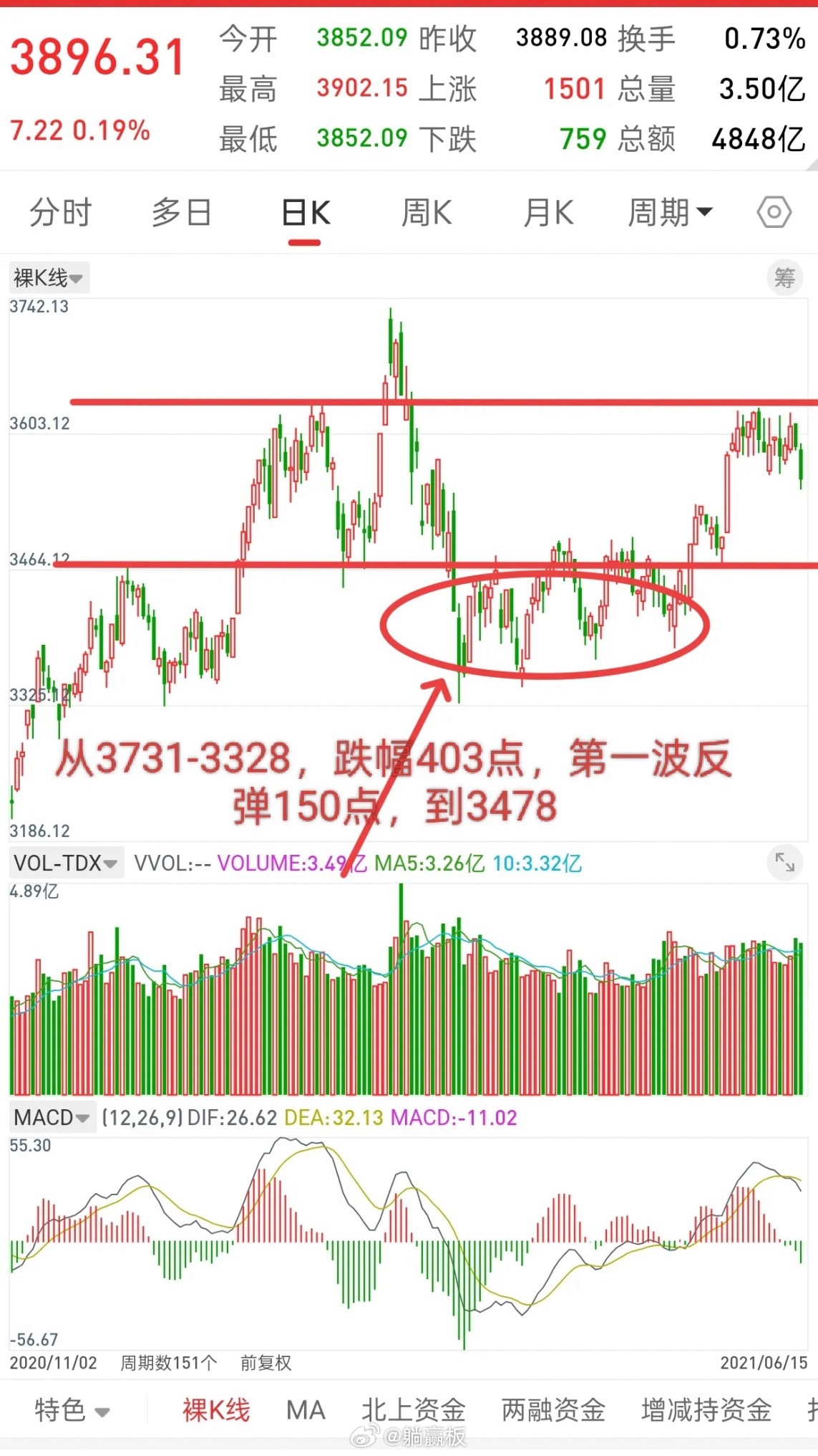 我在3.24号早上盘前的时候,当时说2021年3月,当时大盘从3731一路下跌至3328,跌幅403点,然后开始反弹,第一波反弹150点,到3478。然后探底,再拉升,就是反复洗盘,但是低点越来越高。