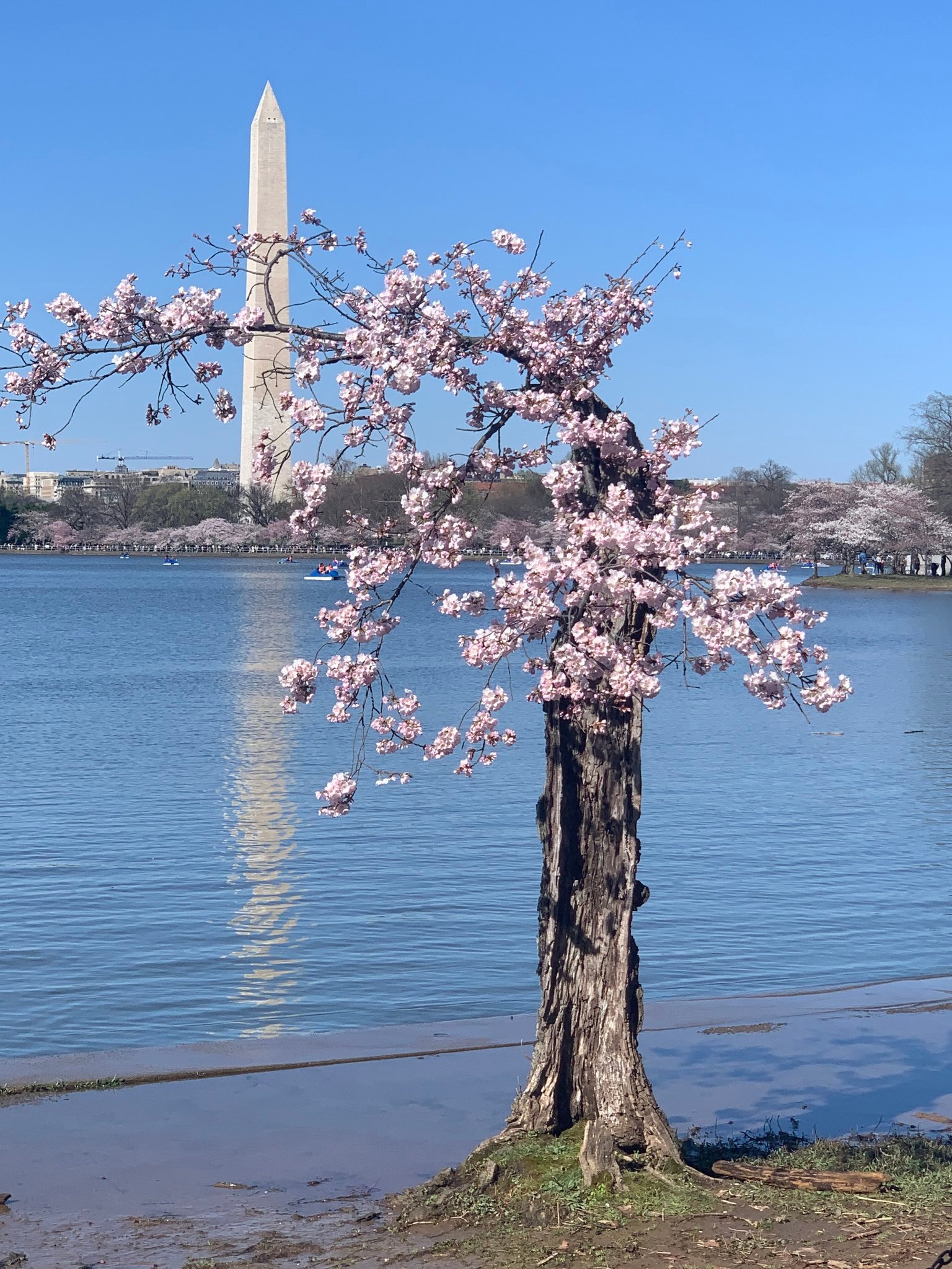 ¹ 美国人把漂亮的染井吉野樱花种出了“美国精神”。图1这棵樱花树叫Stumpy,矮胖子、残桩的意思。按理说难活,因为长在华盛顿纪念碑旁边的潮汐湖(Tidal Basin)岸(看看多么靠近湖水,很容易烂根),地势最低洼,最容易受灾。但它这些年还是活着,还能开花。身残志坚!