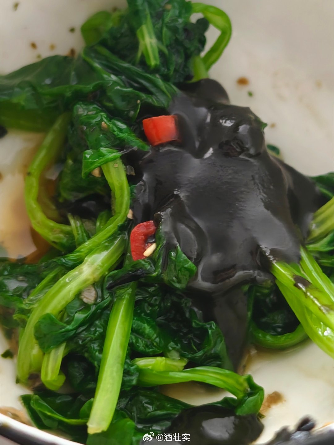 自制菜→黑芝麻小米辣拌芹菜叶 大厨今天也是百密一疏,用了不能进微波炉的味碟做蒜头