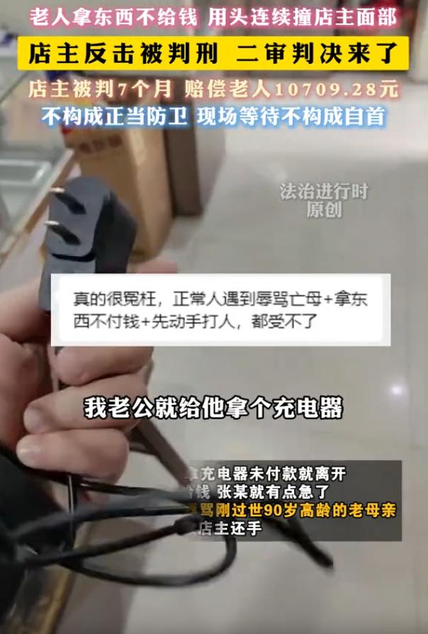 一片唏嘘!江苏苏州,一老人进店免费下载歌曲未果,就要把店里的充电器拿走,老板提醒他要付款,结果老人用头连续顶撞店主面部,还辱骂店主过世的母亲,店主忍无可忍反击,结果却被判刑+赔偿。法院:不构成正当防卫 陈某开了一家音像店,2024年的一天,老人张某拿着唱戏机来到店里,要求免费下载戏曲,陈某告知,免费下载可以,而且可以下载四次,但需要提供发票,可老人提供不出来 老人没走。他又说自己充电器坏了。陈某也没多想,顺手拿了个新充电器让他试。一试,机器能响了。接下来发生的事就变了味。老人没打算付钱,拿着东西就要走人 陈某只好追出去,语气也没什么火气,就跟他说:师傅,这充电器五块钱 这句话一出口,老人直接炸了。回头就骂,越骂越难听,连陈某刚去世的母亲都被他扯出来骂了个遍 陈某忍着,没动手 可老人没停手,准确说,是没停头。他开始用头顶陈某的胸口,一下接一下,还上手推肩膀。旁边街坊都看愣了,买东西不给钱,还追着人骂,骂完还用头撞 陈某一直退,一直躲。直到老人第三次拿头往他脸上顶的时候,他用手臂和旁边的音响进行了回击,老人鼻子骨折了,鉴定下来是轻伤二级 老人被120拉走送医,陈某被带走。几个月后法院判了,故意伤害罪,7个月。法院的理由是,他反击的力度太大,超过了必要限度,不构成正当防卫 很多人第一反应是,凭什么? 一个老人,进店不花钱要服务,免费的不行就拿东西不给钱,被提醒了反而骂人、用头撞人,还专门挑对方刚去世的家人骂。店主忍到最后,抬手挡了一下,反倒被判刑 法律上确实有一套逻辑。轻伤二级属于刑事犯罪,防卫过当的判断标准是看手段是否明显超过必要限度。法院认为,人家用头撞,你抬手挡,结果把人家鼻子弄骨折了,这个结果是超出了合理范围的 但问题在于,正当防卫这事,坐在法庭上看监控和站在现场挨撞挨骂,完全是两个感受 这样的事看下来,不免让人唏嘘。对此,你怎么看呢? 老人拿东西不给钱还撞店主 法院判了