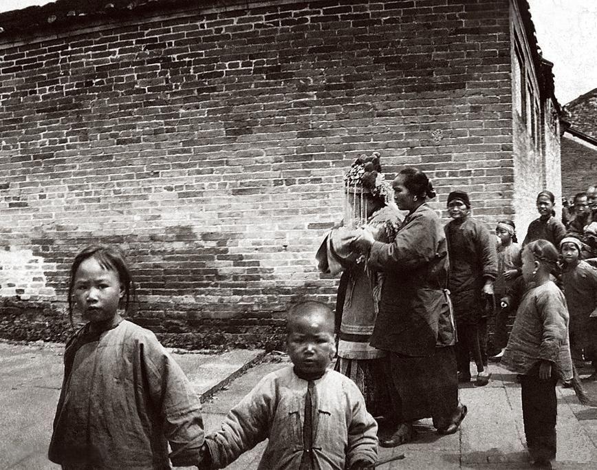 晚清,岭南地区(广东一带)的民间婚礼,新娘头戴华丽的凤冠头饰,面部被细密的珠穗盖头(面帘)完全遮挡,这是岭南地区典型的“遮面婚俗”,寓意新娘在拜堂前不与外人相见,保持庄重与神秘感,她身着绣有花纹的传统嫁衣,由身旁的妇人搀扶前行。 周围簇拥着看热闹的乡邻与孩童,他们穿着朴素的粗布短打,是晚清底层百姓的典型装束。两个手牵手的孩童好奇地望向镜头,与后方庄重的新娘形成鲜明对比。