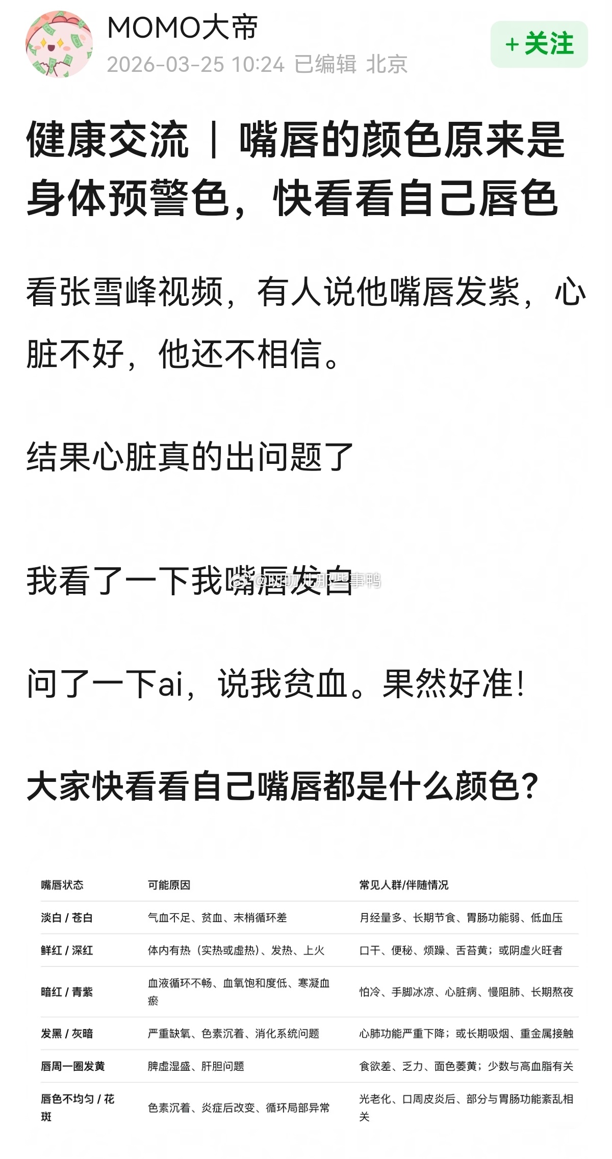 嘴唇的颜色原来是身体预警色,快看看自己唇色~👄👄