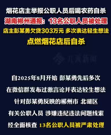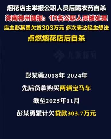湖南郴州,男子贷了303.7万,买了房,买了两辆宝马车,还经营了两家烟花零售店,他还不起这些钱了,他举报了13个公职人员,随之燃爆自家的烟花店,事后有人说,他在办理销售许可证时受阻,进了1000多万的货,实在没办法,才走上绝路。 2025年11月30日,一声巨大的爆炸声响起,彭某勇的烟花店,一个巨大的火团冲天,滚滚的浓烟往上冒,店被炸了,墙坍塌了,爆炸的冲击,将路边的车掀翻,还引燃了路边的车。 爆炸的冲击力,将周围住户的玻璃窗户,震得碎了一地,这一声巨响,这大爆炸,让目睹的人,事后依然心有余悸。 真的太可怕了,烟花店爆炸了,这个消息迅速传开,大家纷纷猜测,应该是烟花店里有人抽烟,引起的大爆炸,也有人猜测,是不小心着火了。 大家猜测了很多种可能,事实却是,是烟花店的店主彭某勇,自己燃爆了自己的烟花店,这更是让人难以置信。 据有人所知,彭某勇可是进了1000多万烟花,就等着过年大卖,大赚一笔,眼看就要过年了,就要挣钱了,他怎么可能会一把火,燃爆自己的烟花店呢? 一个店主,自己引爆自己的烟花店,此时让人不可思议,店主的背后到底有何隐情? 据调查所知,彭某勇欠下了不少债。 从2019年以来,这个彭某勇就经常贷款,贷款的渠道多种多样,有时办信用卡贷款,有时在网上的平台借贷,还有的从卡行里贷款,他贷了一次又一次,总共就贷下了303.7万元。 他贷这么多钱,是否就是为了做烟花店生意呢? 调查事实并非如此,据调查所知,彭某勇在2018年就买了一辆宝马,在2024年又买了一辆宝马,这些钱都是贷款买的。 除此之外,他买房也是贷款买的,他经营的两家烟花店,自然也是贷款经营的,甚至日常消费支出都是贷款来满足的。 他一共贷了303.7万元,到了2025年的12月他才还掉67.7万,剩下200多万没有还清。 欠下这么多钱,其实彭某勇早就身心疲惫,从2025年8月开始,就已经多次有轻生的想法。 在轻生之前,他做了一件大事,那就是举报了13名公职人员。 在2024年的春节,一个公职人员就向彭某勇索要价值5000元的烟花,这让彭某勇非常的反感,他还在朋友圈里吐槽送烟花的事情,虽然烟花被退回了,但是彭某勇心里依然不舒服。 其中有一个公职人员,帮助了这个公职人员索要5000元烟花,还要彭某勇宴请吃饭,这同样让彭某勇心里不舒服,他宴请的公职人员还不止这一个。 有的公职人员在他的烟花店买烟花,只有100块钱,他也不付款,他一共举报的有13个公职人员,这些公职人员,或多或少在某方面都有违法违纪的事情。 办完这件大事,彭某勇又想起自己身上的压力,他欠下这么多债,身上还有这一批烟花的压力,他实在是扛不住了,于是燃爆了自己的烟花店,然后喝农药自杀了。 烟花店爆炸造成了严重的后果,有三个人受伤,有两辆车被损毁,周围的房屋受损。 事情发生之后,由于彭某勇在自杀之前,还举报了13位公职人员,让大家觉得此事不简单。 大家的目光都投到了彭某勇的两家烟花店上,在烟花店没有爆炸之前,彭某勇家的烟花真的很多,这些货款就不止这几百万。 有知情的人就站出来说了,彭某勇因为办理销售许可证受阻,才会压下大量的存货,有人在事后说,彭某勇进了1000多万的货。 压了这么多存货,销售许可证办不下来,他本身就已经有200多万的贷款没有还清,又压了这么多的货,压力可想而知。 大家猜测彭某的离世,更多的可能,应该是因为这1000多万的货,压得他喘不过气了,他这才选择举报公职人员,选择轻生。 发生这样的悲剧,或许是彭某有没有看清自身的能力,贷款消费,贷款做生意,所以才会欠下这么多的债,才会压得他喘不过气。 一般情况下,如果彭某勇轻生,他的法定继承人放弃继承他的遗产,那么继承人是可以不用还他所欠下的这些贷款的。 《民法典》第1161条‌规定:继承人以‌所得遗产实际价值为限‌清偿被继承人依法应当缴纳的税款和债务;‌放弃继承的,对被继承人的债务可以不负清偿责任‌。‌ 至于彭某勇举报的这13个公职人员,即使彭某有离世,这些公职人员,如果确实有违法违纪的行为,他们依然要受到处理。 《刑法》有相关规定,公务人员如犯有贪污罪、受贿罪、滥用职权罪等,将受到相应的刑事处罚,包括有期徒刑、拘役、罚金等。 现在这13个公职人员都被处罚了,彭某勇也轻生离世,结束了自己的压力。 事情结束了,但彭某勇的事情却让不少人反思,贷款一定要量力而为,不可超出自己的承受范围。 那么你对彭某勇的事情有何看法呢?