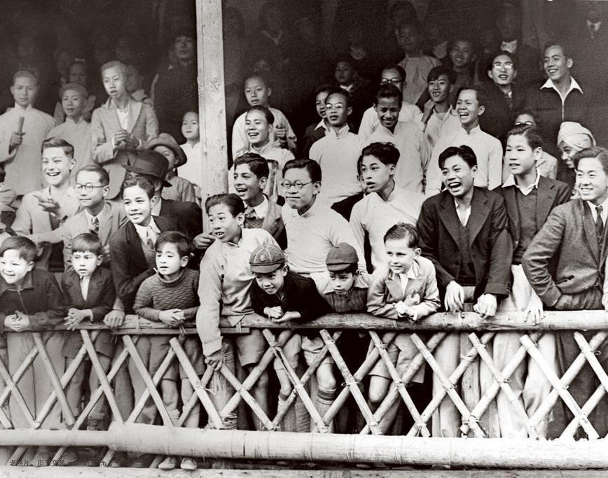 民国,上海,不同文化背景的民众共享城市空间,共同参与公共娱乐与生活,人群里既有身着长衫、学生装的中国孩童与青年,也有穿着西装、毛衣的外国侨民孩童,不同的人挤在竹制栏杆后,共同望向同一个方向。 所有人都笑容灿烂、神情兴奋,有的咧嘴大笑,有的探身张望,显然是在围观一场热闹的公共活动——可能是街头表演、体育赛事、游行庆典,氛围热烈而欢快。