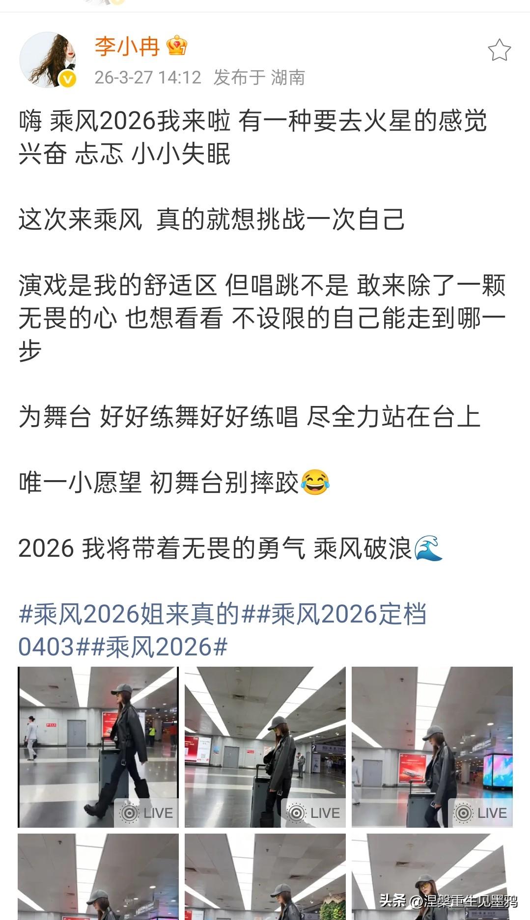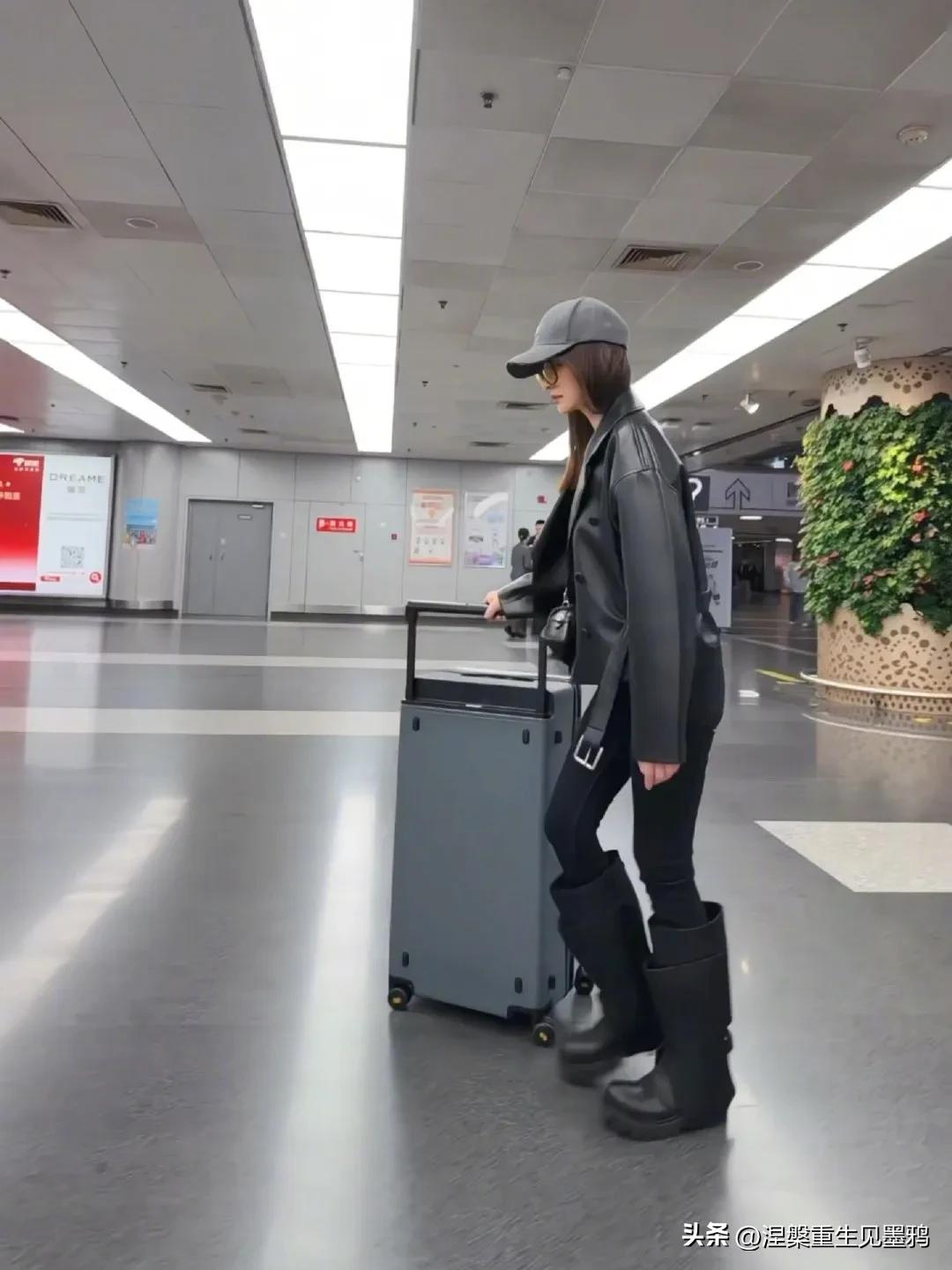 李小冉即将参与《乘风2026》,心情既复杂又激动。 忐忑与期待:她既因要挑战唱跳这一新领域而感到紧张,又满心期待能突破自我,想瞧瞧不设限的自己究竟能走多远。 无畏与勇气:怀揣着无畏之心,她甘愿走出演戏的舒适区,在唱跳舞台上全力以赴。 憧憬与兴奋:她对这段新旅程满怀憧憬,为能突破舒适区、与全球优秀女性同台竞技而兴奋不已。过往的经历让她更明白突破的意义,这份激动里还带着对曾经那个勇敢的自己的致敬。 李小冉身着黑色皮衣,搭配黑色长裤与长筒靴,头戴灰色棒球帽,拉着行李箱向前迈步,尽显自信从容。在机场环境的衬托下,营造出一种时尚又酷帅的氛围感,宛如时尚大片中的主角。