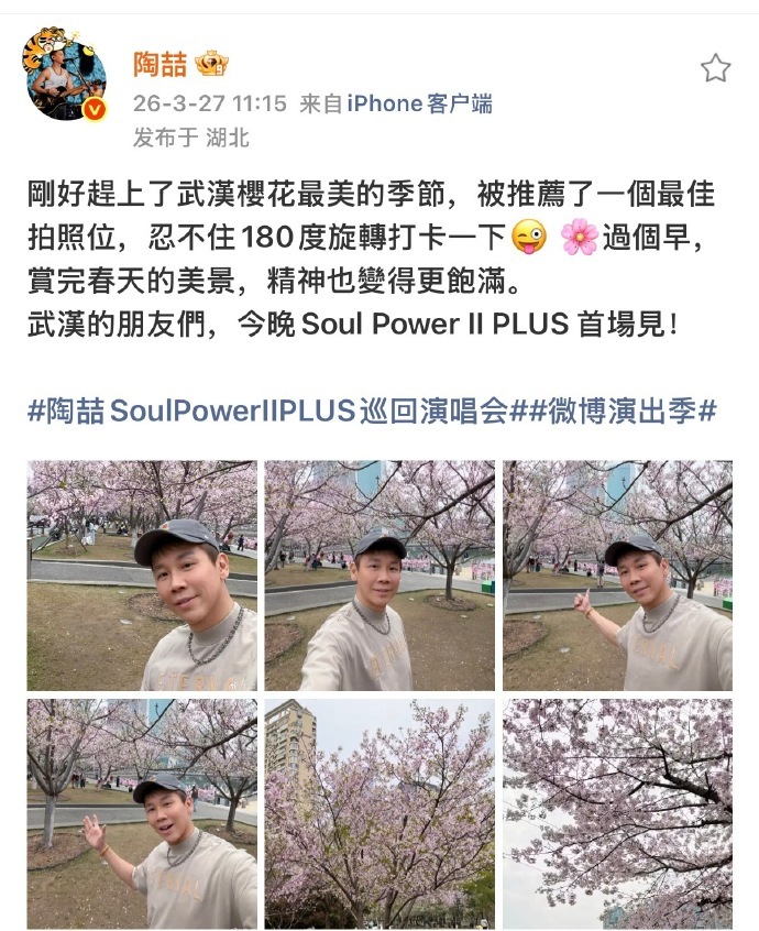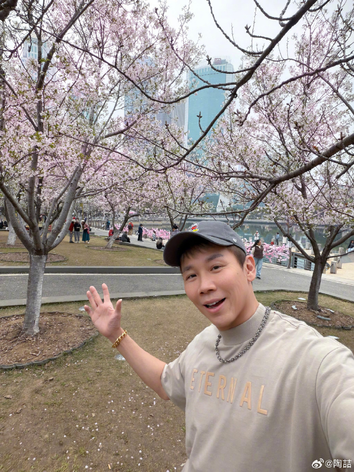 陶喆180度樱花自拍 看陶喆为了出片这么拼我突然释怀了,原来明星也躲不过“这个角度不行再转一下”的魔咒,樱花树下的大家都是一样的可爱。