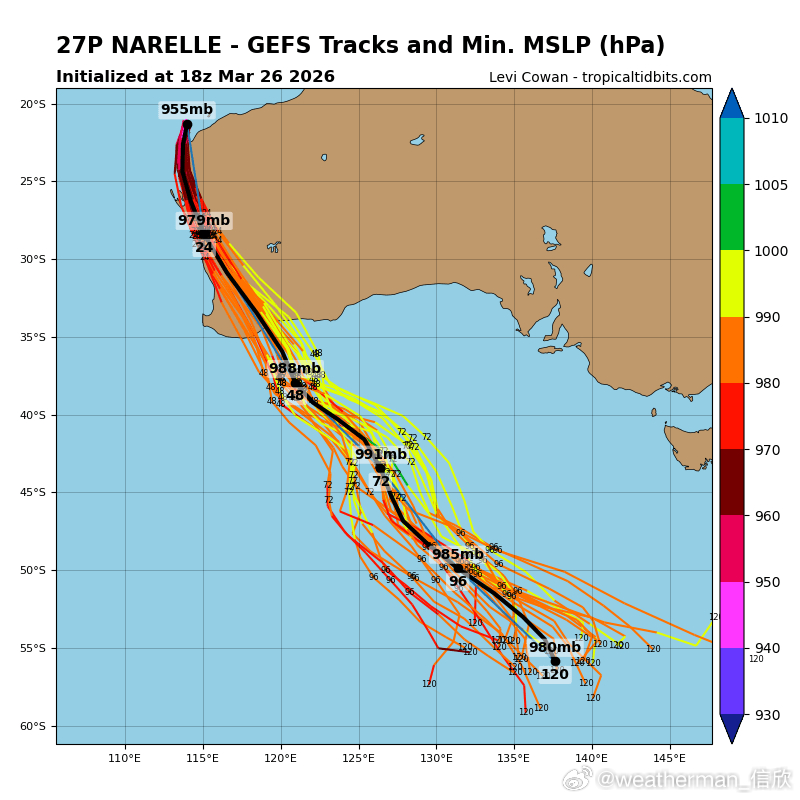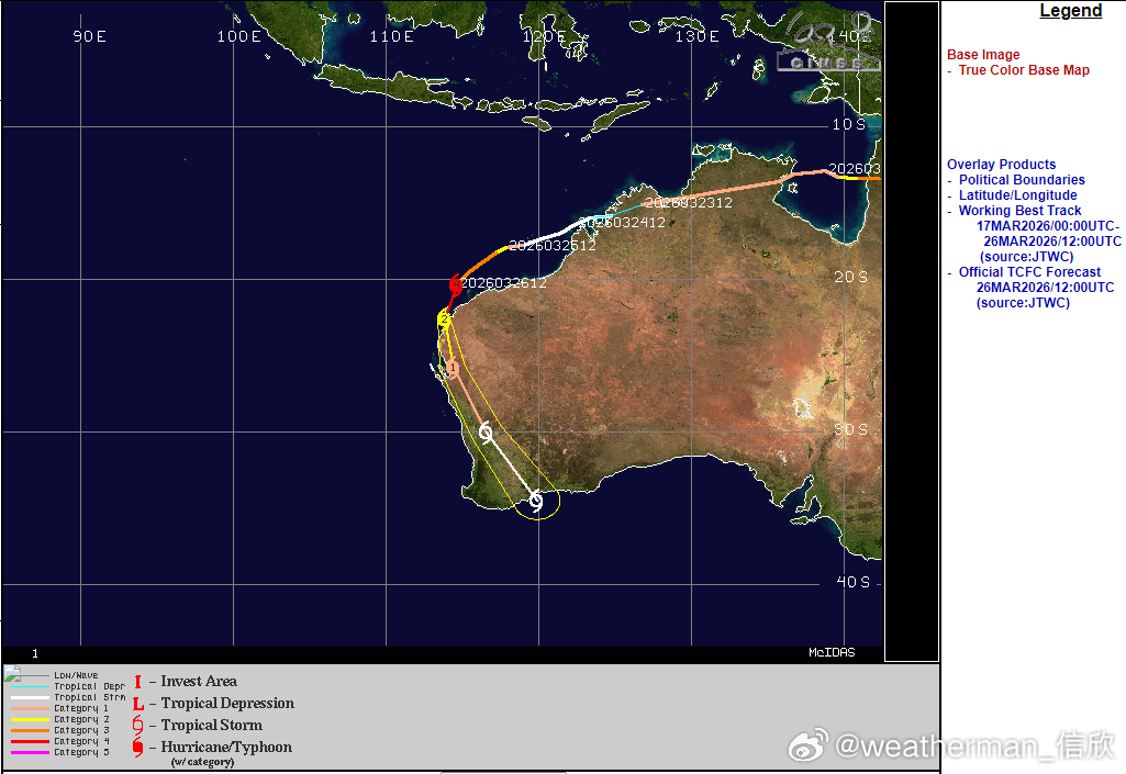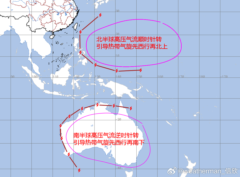 未来这个气旋总体会继续向南偏东方向移动,基本把澳大利亚北侧和西侧的海岸线,走了一遍。因为引导热带气旋移动的高压,在南半球的气流方向为逆时针转,因此这个热带气旋路径,先向西行,再转为向南移动。而在北半球反过来,经常看到的是热带气旋,先西行再转为北上。