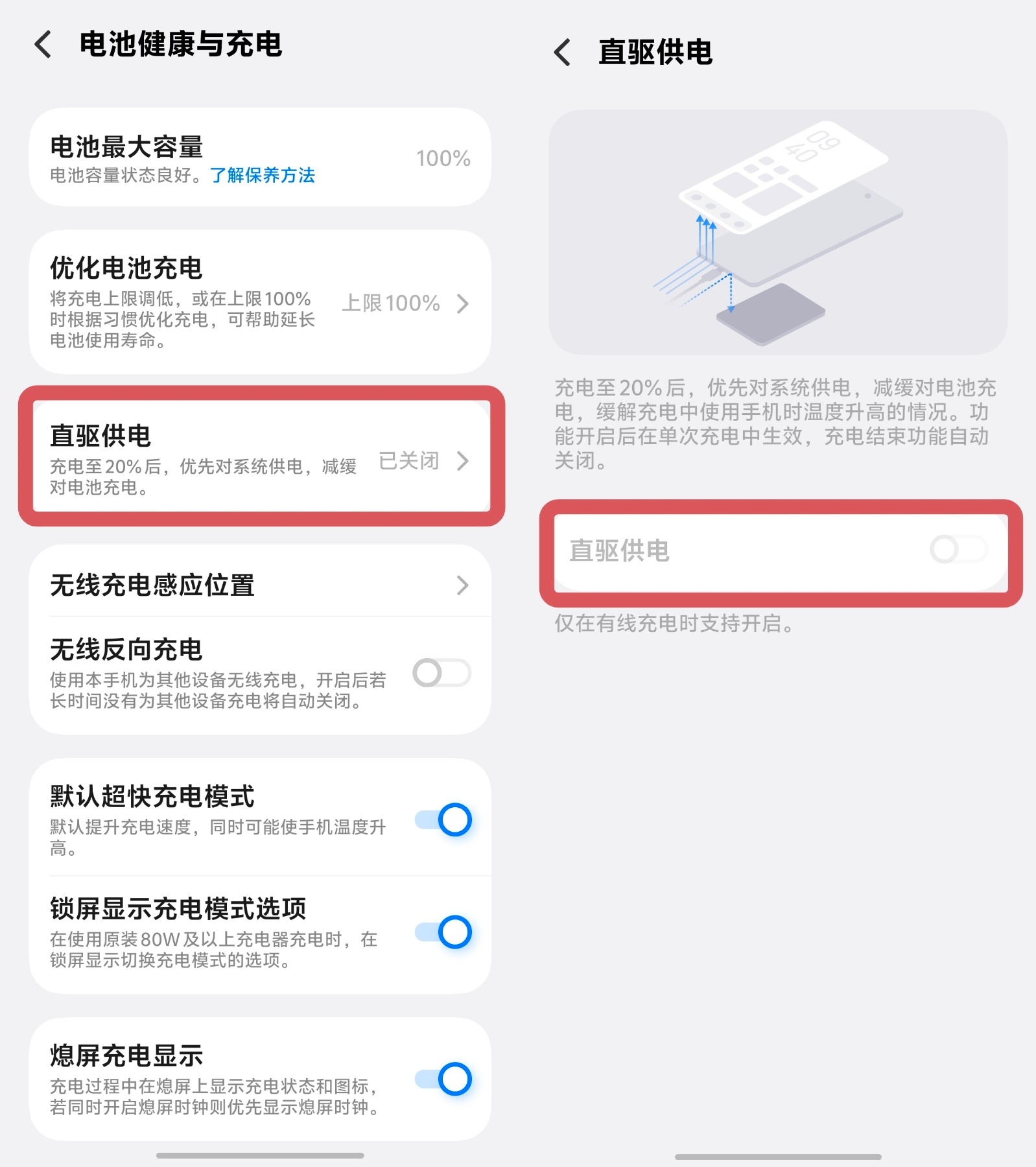 以vivo手机为例,尤其是玩游戏的时间,建议不要边冲边玩,这样电池损耗最大!建议要玩的话,打开直驱供电,这样可以最大限度保护电池。