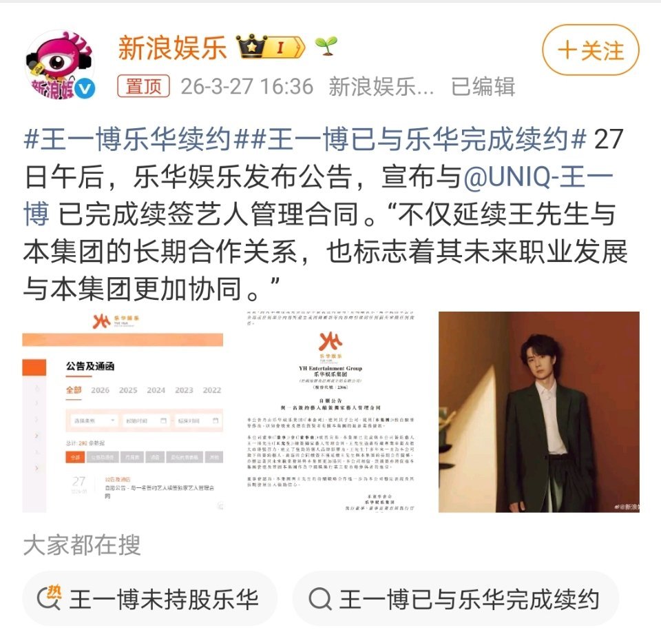 王一博乐华续约公告