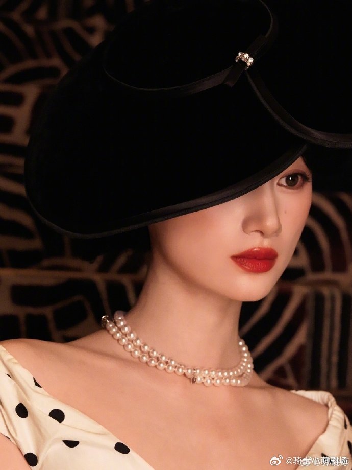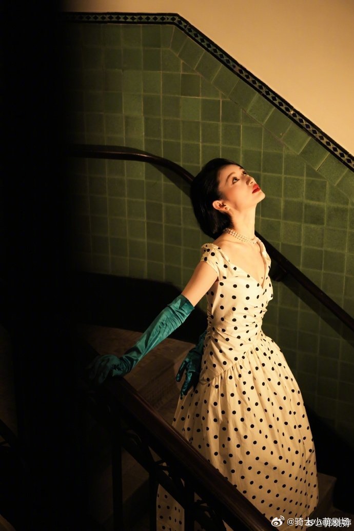 郭晓婷复古名伶郭晓婷复古波点v领裙珍珠点缀波点裙,郭晓婷演绎复古名伶,一颦一笑都极具魅力郭晓婷