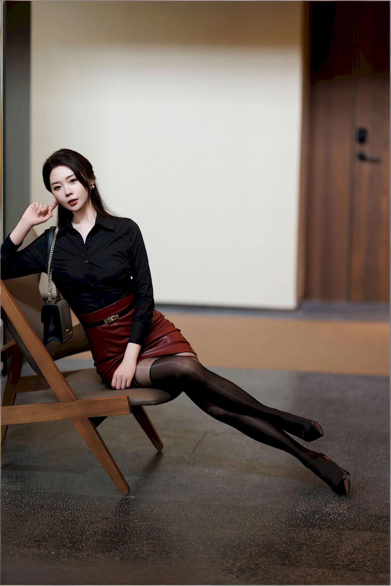 当黑衬衫的利落遇上酒红皮裙的明艳,是职场锋芒与女性柔美的完美对撞。 挺括的黑衬衫剪裁利落,每一寸布料都像是她严谨态度的注脚,将干练刻进骨子里;高腰酒红皮裙带着恰到好处的光泽,裙摆的开叉设计藏着小性感,像她骨子里不愿被定义的鲜活。黑色丝袜与高跟鞋勾勒出修长线条,仿佛在诉说:专业与魅力,从来不是单选题。 她靠在木质柜边,姿态松弛却难掩气场,肩头的黑色链条包是精致的注脚,背景里暖调的灯光与雅致陈设,为这份飒爽添了几分温柔底色。这哪里是穿搭,分明是当代女性的自我宣言——在规则里保持锋芒,在精致中不失温度,把每一个日常,都过成独属于自己的高光时刻