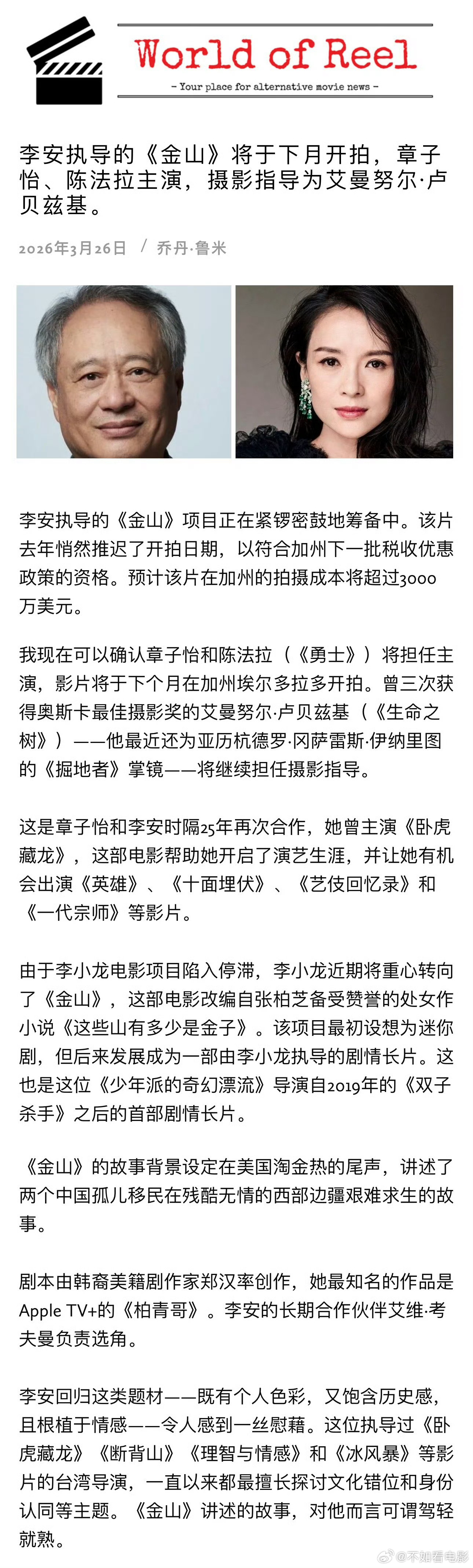 李安新片下个月开机章子怡李安再合作 李安导演新作《金山》将于2026年4月在美国加州开机,这是他与章子怡继《卧虎藏龙》后时隔25年的再度合作。电影改编自华裔作家张辰极小说首作《金山的成色》,外媒《World of Reel》独家披露章子怡将担任主角,陈法拉共同主演,她近年凭《尚气与十环传奇》《哥斯拉大战金刚2:帝国崛起》在好莱坞持续发力。凭借《鸟人》《荒野猎人》《地心引力》连夺三届奥斯卡的摄影师艾曼努尔·卢贝兹基将担任摄影指导,《弹子球游戏》编剧郑韩帅担任编剧。本片预算超3000万美元,故事设定于美国“淘金热”末期,聚焦两名华人移民孤儿的漂泊与闯荡。