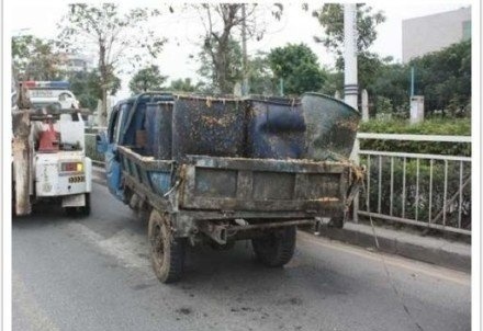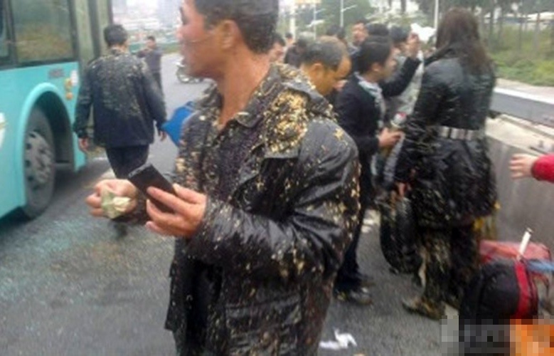 【来自投稿】2013年1月2日,深圳。一辆公交车不幸和一辆泔水车追尾,公交车的挡风玻璃被撞破,泔水车里的泔水破窗而入,乘客们被浇得浑身脏透了。