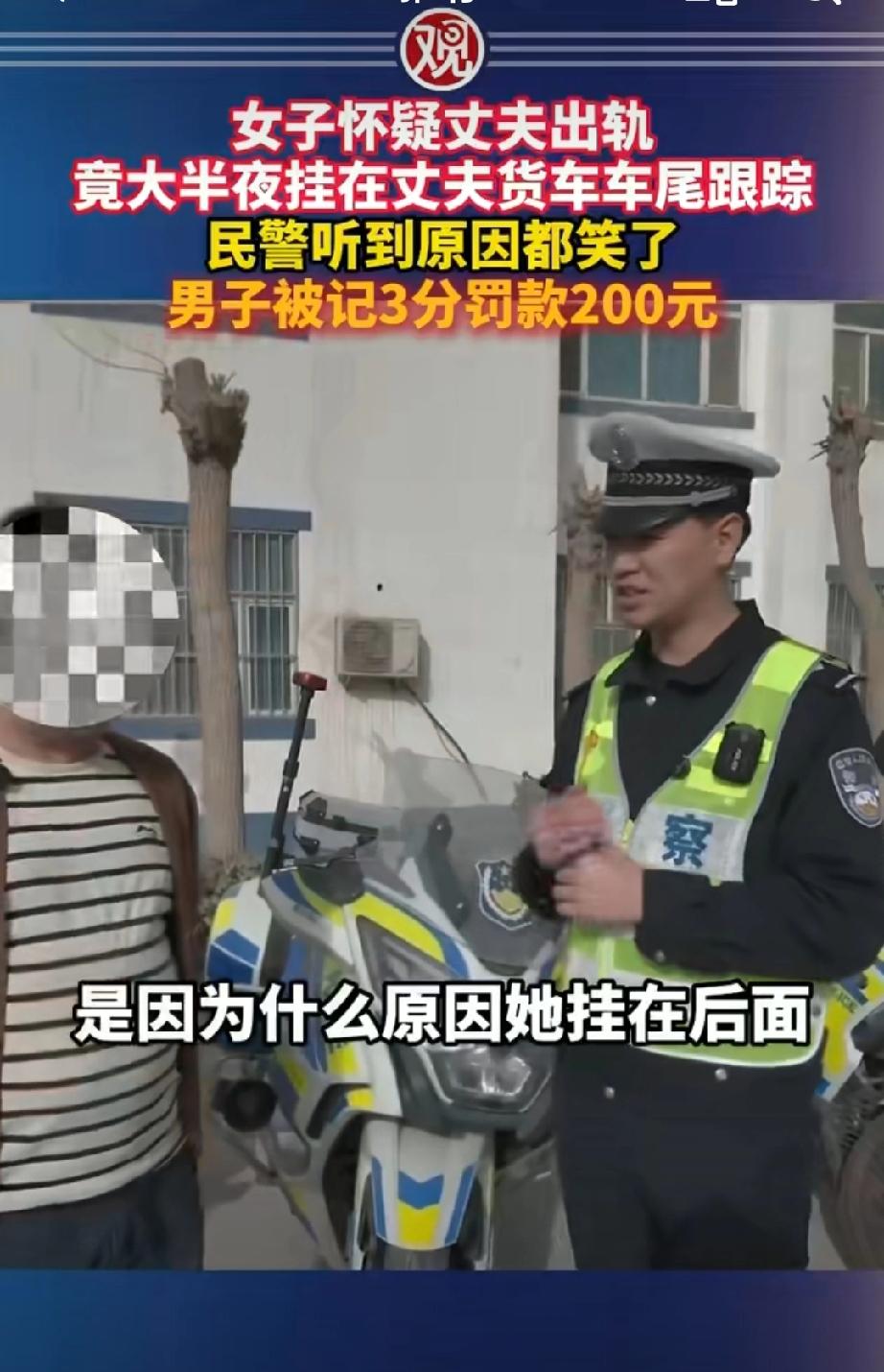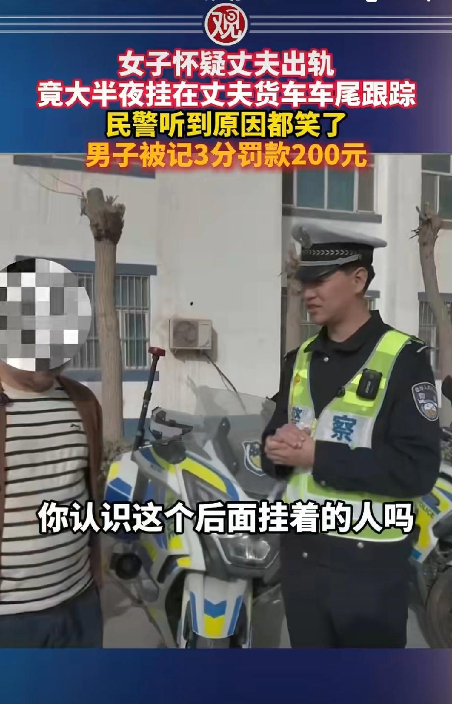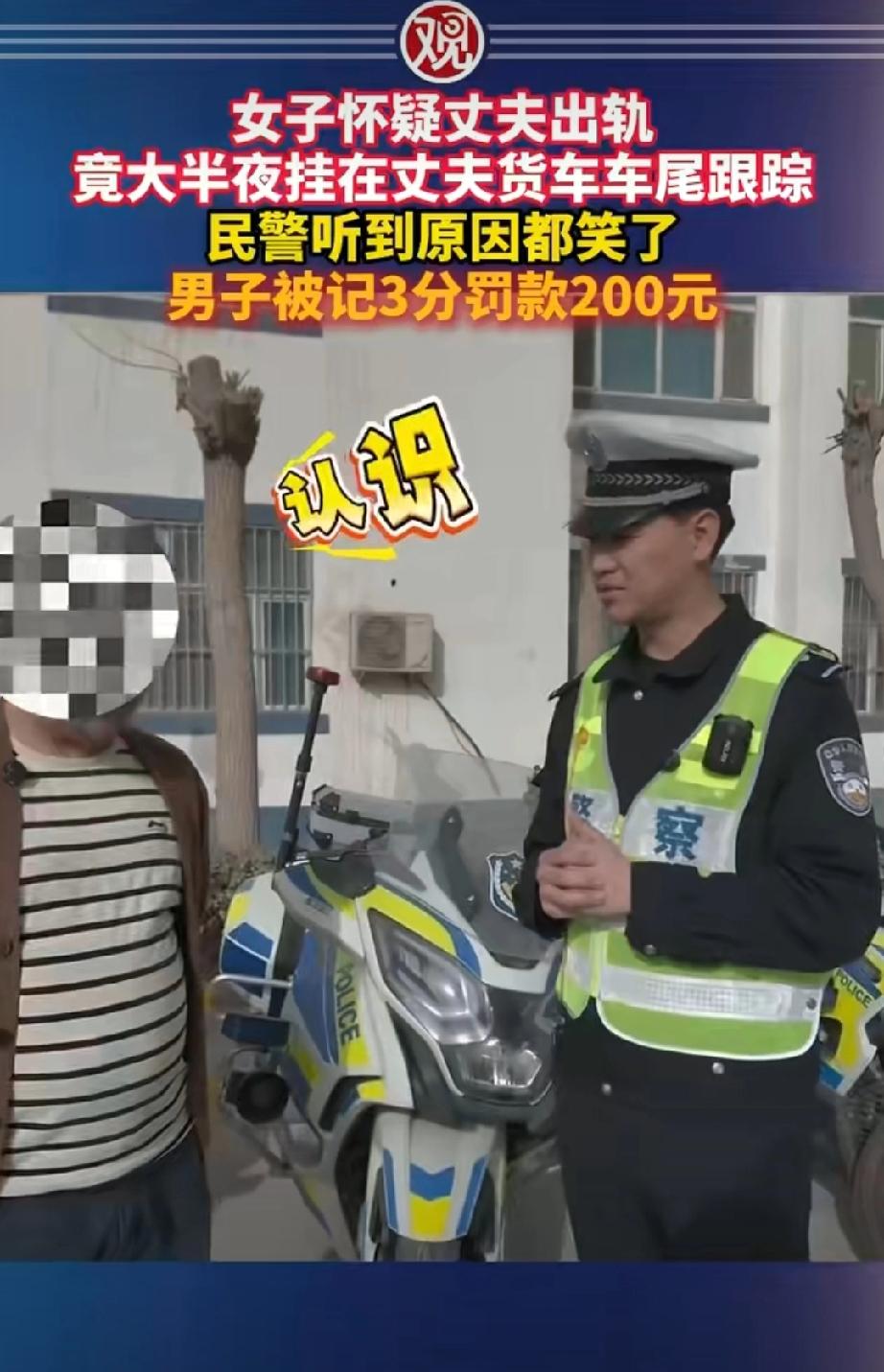 虚假的跟踪:装GPS定位器,真实的跟踪:肉身扒车尾!女子怀疑大货车司机出轨,晚上扒在车尾跟踪被交警发现,民警依法对司机记3分罚款200元…为啥罚司机?什么女版007…[泪奔][泪奔][泪奔]车辆导航定位器 定位器罚款 北斗导航定位器
