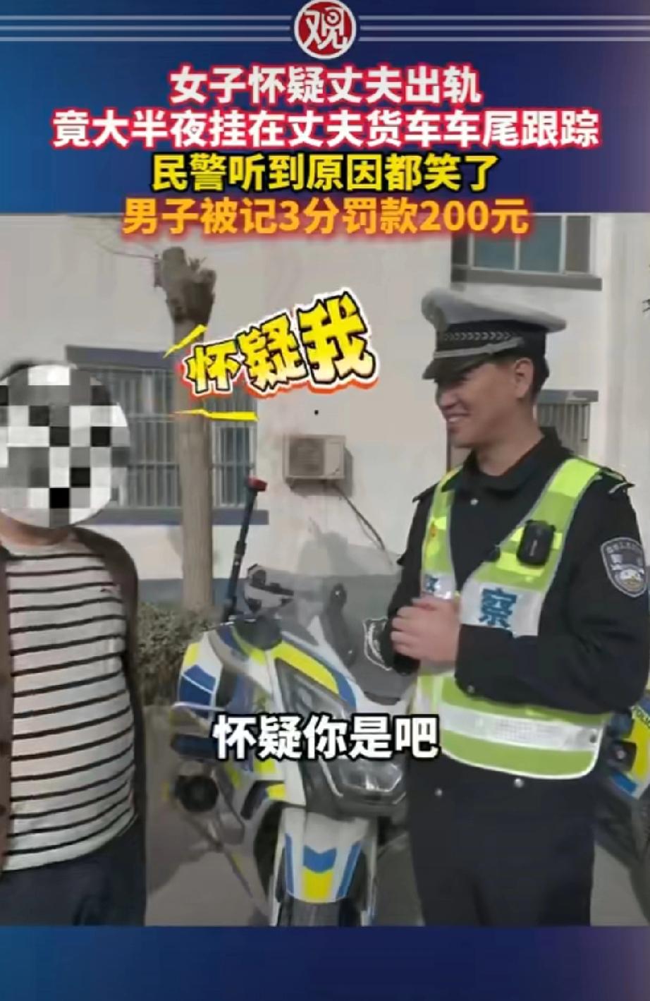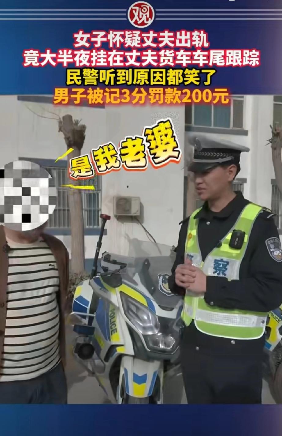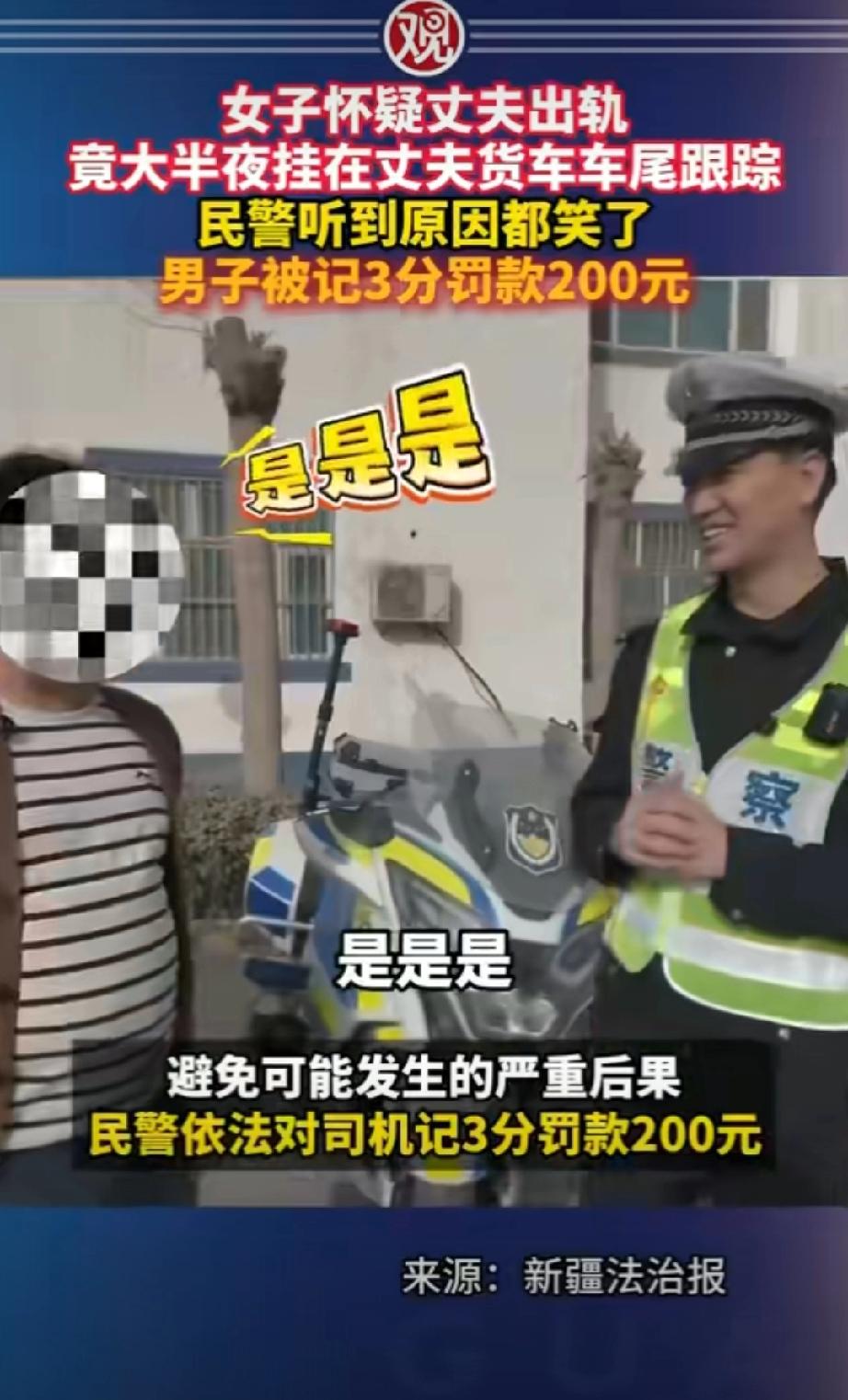 虚假的跟踪:装GPS定位器,真实的跟踪:肉身扒车尾!女子怀疑大货车司机出轨,晚上扒在车尾跟踪被交警发现,民警依法对司机记3分罚款200元…为啥罚司机?什么女版007…[泪奔][泪奔][泪奔]车辆导航定位器 定位器罚款 北斗导航定位器