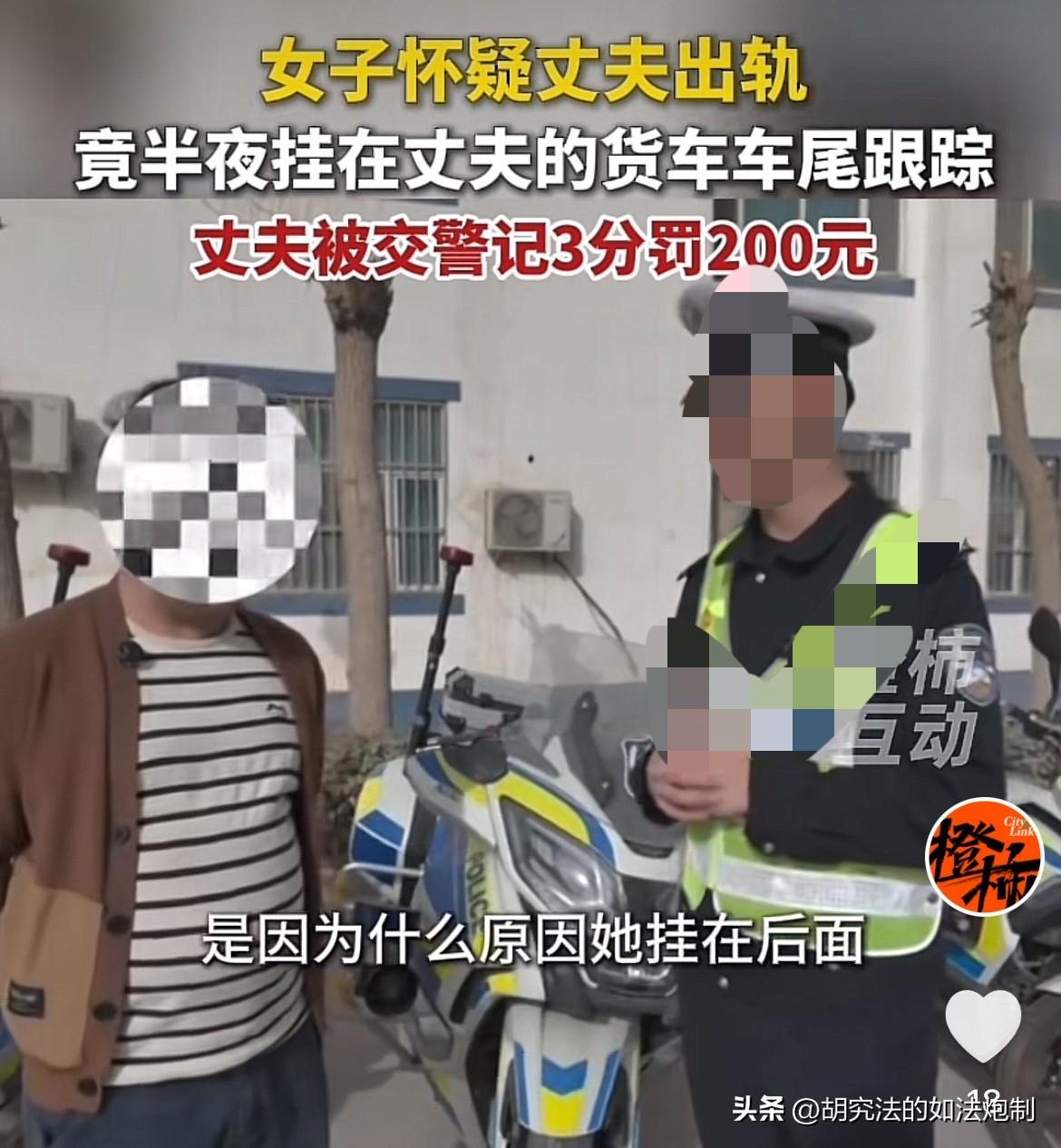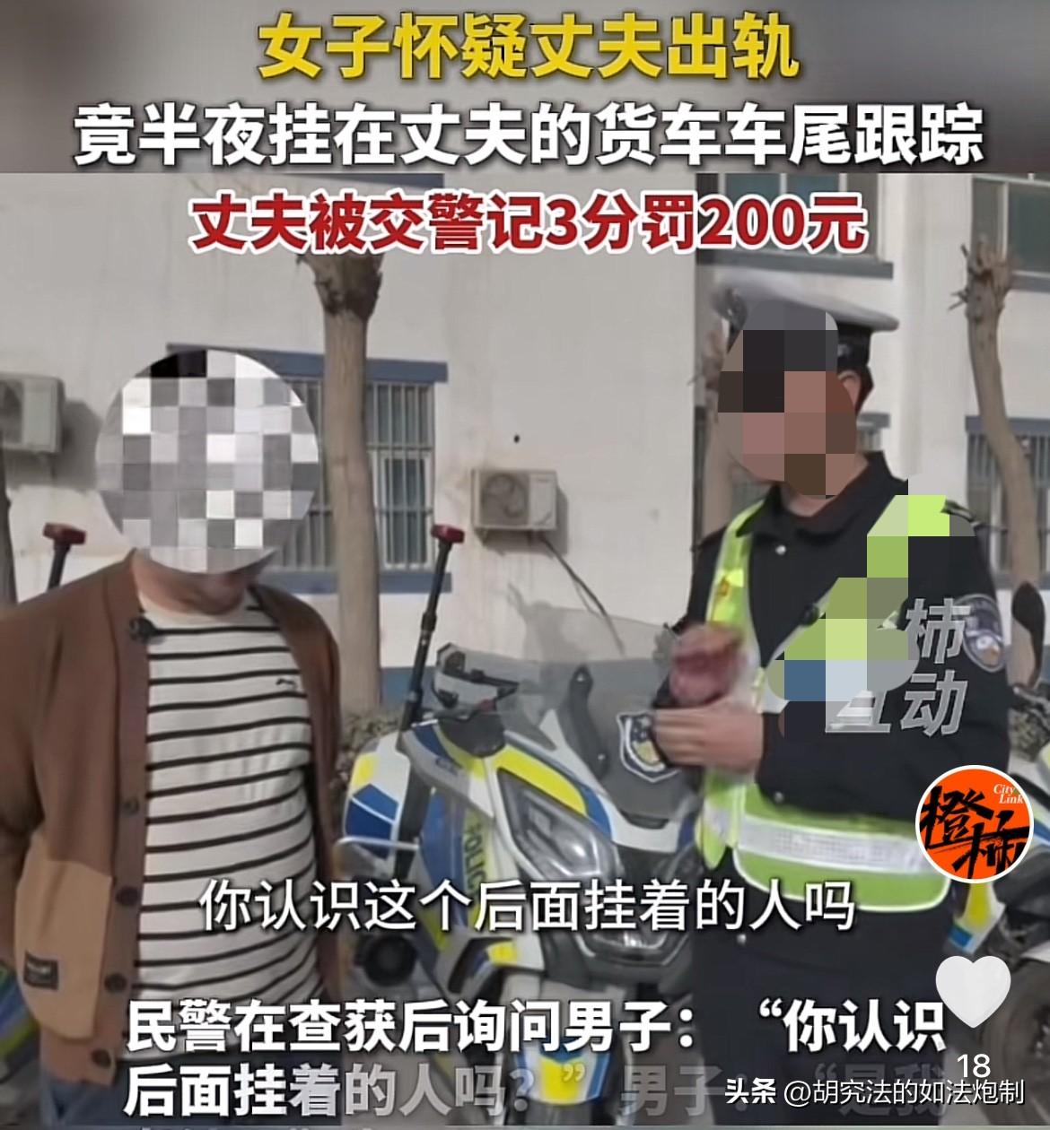新疆喀什,一女子怀疑开大货车的丈夫出 G,趁着夜间丈夫不注意,把自己挂在大货车车尾,试图追踪丈夫。结果在路上,被执勤民警发现并拦下。结果悲剧了,丈夫被记3分,还被罚了200元。网友:这才是真爱! 女子跟丈夫结婚很多年了,两口子的日子一直过得平平淡淡。再加上丈夫是一名大货车司机,一年到头,大部分的时间都在外地,虽然挣的多,在家的时间却很少。 每次丈夫回家,女子总会给丈夫准备一大桌子菜,有的时候甚至还会画上精美的妆容,就是为了给丈夫一个惊喜。 可丈夫呢,回家之后吃完饭便往那一坐玩手机,玩累了就跑到床上睡觉,女子想跟丈夫聊聊天,丈夫却呼呼大睡起来。 一次两次也就罢了,次数多了,女子心里就犯起了嘀咕。 女子在刷视频的时候,就看到过类似的新闻,只要一个男人对他的妻子不理不睬,态度冷漠,大概率说明外面可能有人了。 怀疑一旦产生就像一粒种子,在女子的心里生根发芽了,从那天开始,女子每天都过得提心吊胆,生怕丈夫外面有人就不再爱她了。 每次丈夫回来的时候,女子总会小心翼翼的去查看丈夫的手机,甚至还会去翻看丈夫换下来的衣服。 折腾了好几次,女子也没有发现丈夫的可疑之处。 按正常来说,既然没有发现可疑之处,就证明了丈夫的清白,可女子还是不信,这次他决定豁出去了! 丈夫又接到了一个单子,需要在晚上出发,收拾的差不多之后,丈夫便出了门。而女子也瞅准了机会,悄悄的跟在丈夫的身后,趁着丈夫不注意,自行挂到了丈夫大货车的车尾。 女子的想法也很简单,如果说丈夫外面真的有人了,那么他最应该做的,应该是去第三者的家里告个别。 只要女子跟着丈夫的车,他在哪里停车,女子就知道第三者的家在哪里。 想法很美好,结果却很搞笑。 大货车车尾上面挂着一个女人如此惊险的一幕,很快就引起路上其他车辆的注意,同时也引起了执勤民警的注意。 民警发现这一幕之后,连忙对大货车进行了截停。 被拦停之后,丈夫还是一脸的懵,他既没有超载,也没有酒驾,交警拦他,能有什么事情? 交警拉着丈夫来到了他的车尾,丈夫这才发现他的老婆竟然也跟上来了。 面对交警的询问,女子也如实交代了自己为什么要这么做。丈夫听完,心里既生气又感到无奈。 为了避免可能发生的严重后果,民警对丈夫作出记三分,罚款200元的处罚。 有人调侃,真不知道该同情这个男子,还是羡慕这个男人,遇到了一个真真正正在乎他的人。虽然女子的做法很危险,还实实在在的把丈夫给坑了,不过他的心情也完全可以理解。 只不过代价确实有些高,作为一名大货车司机来说,一般都要持有a证,一旦驾驶证被扣了分,这对于以后会有不小的麻烦。 不过也有人真的同情这名女子,做出如此危险的事情,也从侧面印证两个人平时的相处到底是什么样子?丈夫有没有关心过他的妻子? 但凡丈夫心里能有妻子的一点位置,妻子也不会做出如此危险的事情。 《民法典》第1042条规定,夫妻应当互相忠实,互相尊重,互相关爱;家庭成员应当敬老爱幼,互相帮助,维护平等、和睦、文明的婚姻家庭关系。 很多夫妻,尤其是中年夫妻,早些年的爱情早就被生活当中的柴米油盐所代替,一睁眼便是生活的压力,整日为了生活而奔波,却忽略了身边那个最爱他的人。 拼搏的样子很美,可钱不是一天就能挣来,有的时候确实也应该停下脚步,好好的陪陪身边的那个人。 对此你怎么认为?