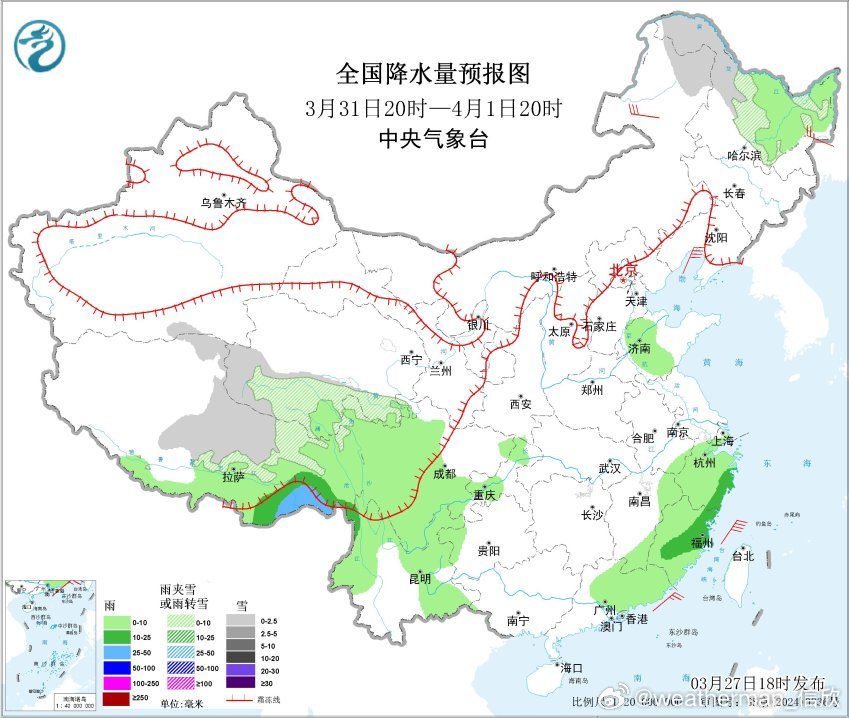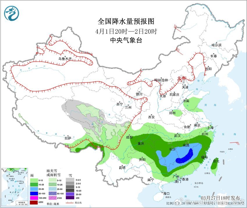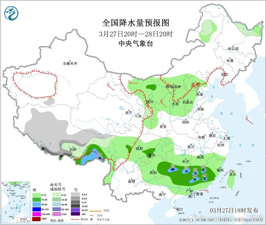 预计,3月27日20时至28日20时,西藏南部等地部分地区有大到暴雪(10~15毫米)。西藏东南部、湖南中南部、江西南部、福建南部、广东北部、广西北部、重庆西部、贵州东部等地部分地区有中到大雨,其中,湖南南部等地局地有暴雨(50~65毫米)。