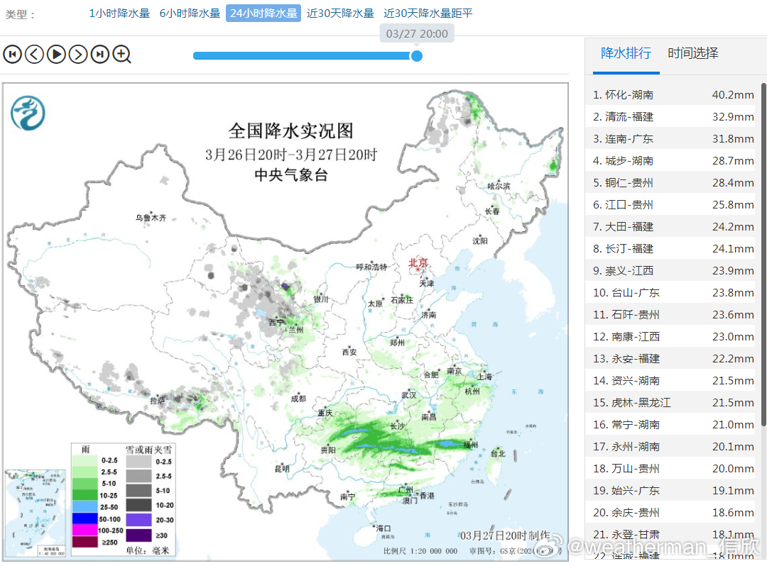 【降水】昨晚到今天,北方的高空冷涡/冷槽导致青海东北部、甘肃河西走廊出现雨雪,甘肃乌鞘岭出现大雪,20时积雪13厘米。南方的切变线降水维持在贵州东部到湖南南部、江西南部、福建一带,贵州铜仁、湖南怀化等站点出现大雨。此外广东出现暖区对流降雨。