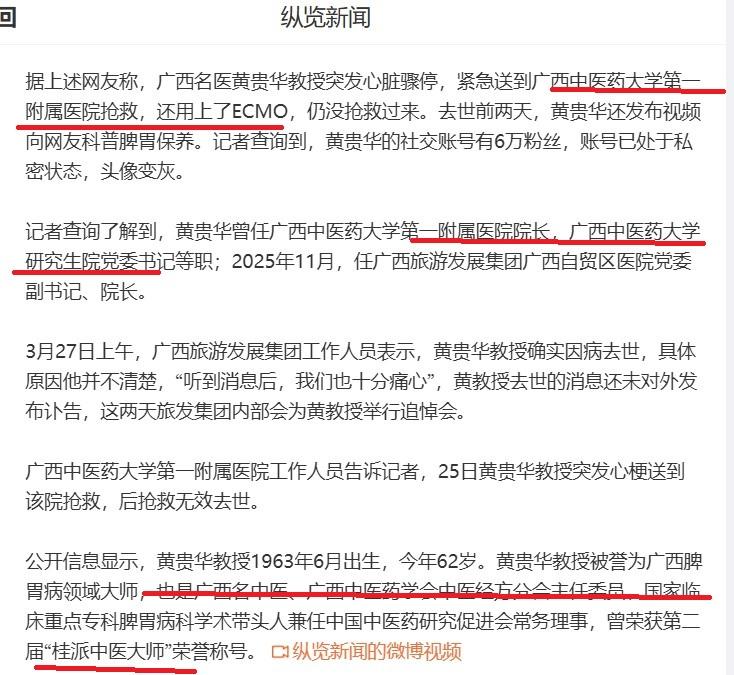 【中医泰斗英年早逝,西医抢救手段遭质疑】广西名医黄贵华突发心梗去世,黄教授是广西中医药学会中医经方分会主任委员、中国中医药研究促进会常务理事,曾任广西中医药大学第一附属医院院长,广西中医药大学研究生院党委书记,荣获第二届“桂派中医大师”称号,去世时年仅62岁。 据报道,黄教授在广西中医药大学第一附属医院接受抢救时,用了ECMO。不久前张雪峰和大名鼎鼎的李文亮都曾接受ECMO救治,均抢救无效去世,这再次引发广大人民群众对现代医学以及中医院引进现代医学的嘲讽和质疑。