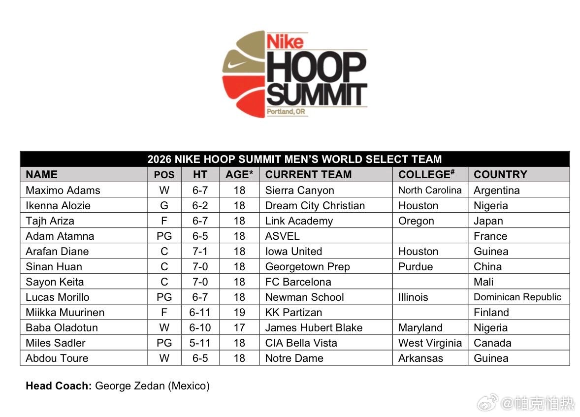 耐克篮球峰会世界队名单,中国球员郇斯楠、承诺俄勒冈的Tajh Ariza入选:🇦🇷 Maximo Adams🇳🇬 Ikenna Alozie🇯🇵 Tajh Ariza🇫🇷 Adam Atamna🇬🇳 Arafan Diane🇨🇳 郇斯楠🇲🇱 Sayon Keita🇩🇴 Lucas Morillo🇫🇮 Miikka Muurinen🇳🇬 Baba Oladotun🇨🇦 Miles Sadler🇬🇳 Abdou Toure