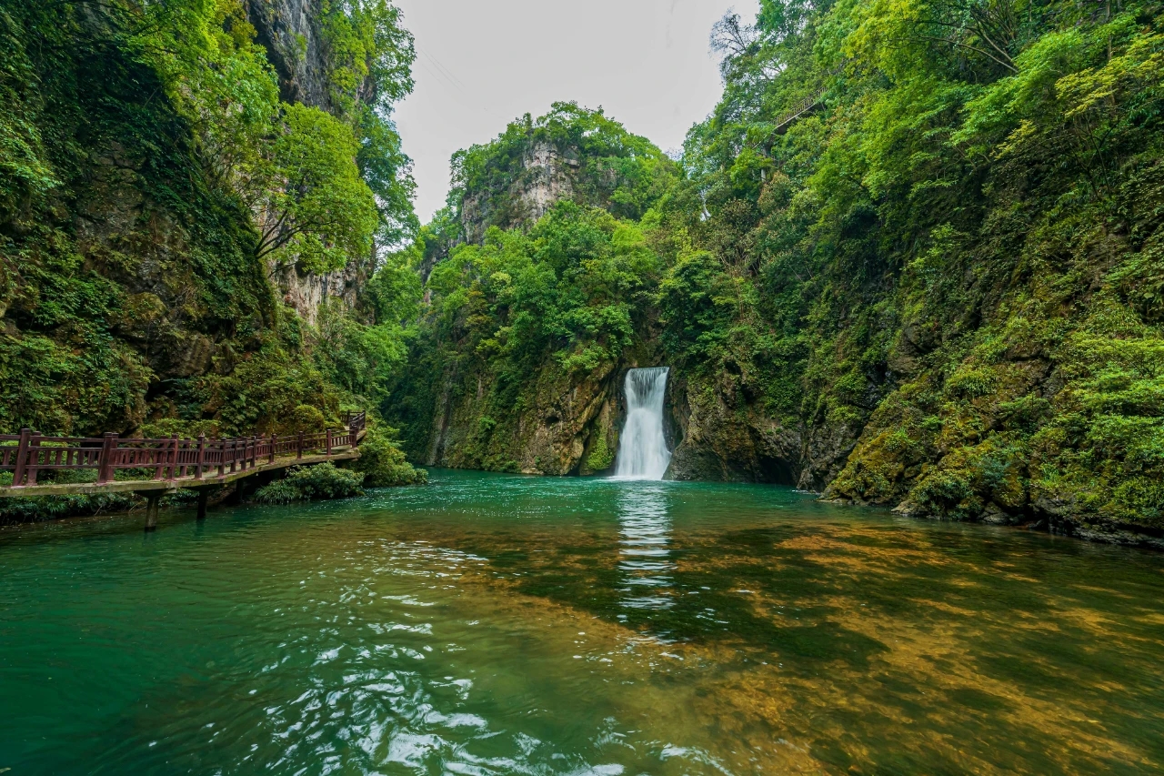 洒金谷如大地裂开的翡翠缝隙,三江(鱼梁江、诸梁江、沙河)在此交汇,切割出百米深峡。晨雾未散时,阳光穿透崖顶树隙,将江面碎成万点金箔,"洒金"之名便源于此间光影魔术。沙河瀑布群如银练垂落,金龟石静卧深潭,与戏龟瀑构成动静相宜的山水小品;诸梁江段则峭壁夹天,栈道蜿蜒,行走其间似穿行于地质史诗的扉页。