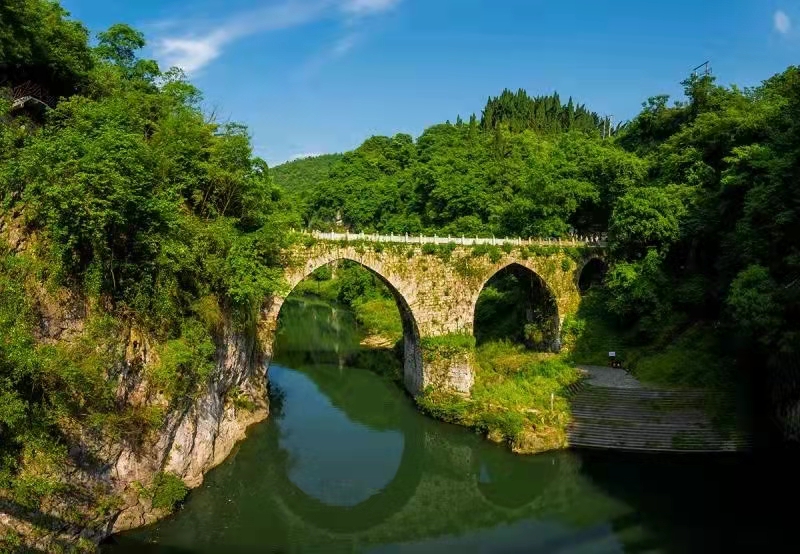 明代葛镜桥横跨峡谷,400年风雨中仍以"豆腐桥"的传说彰显古人智慧。崖壁"天削芙蓉"石刻苍劲古朴,与"鱼梁观"飞檐铜铃共谱岁月回响。古驿道石阶上,依稀可见马蹄印痕,而洒金桥夜雨朦胧的旧时盛景,至今仍是文人墨客的灵感源泉。