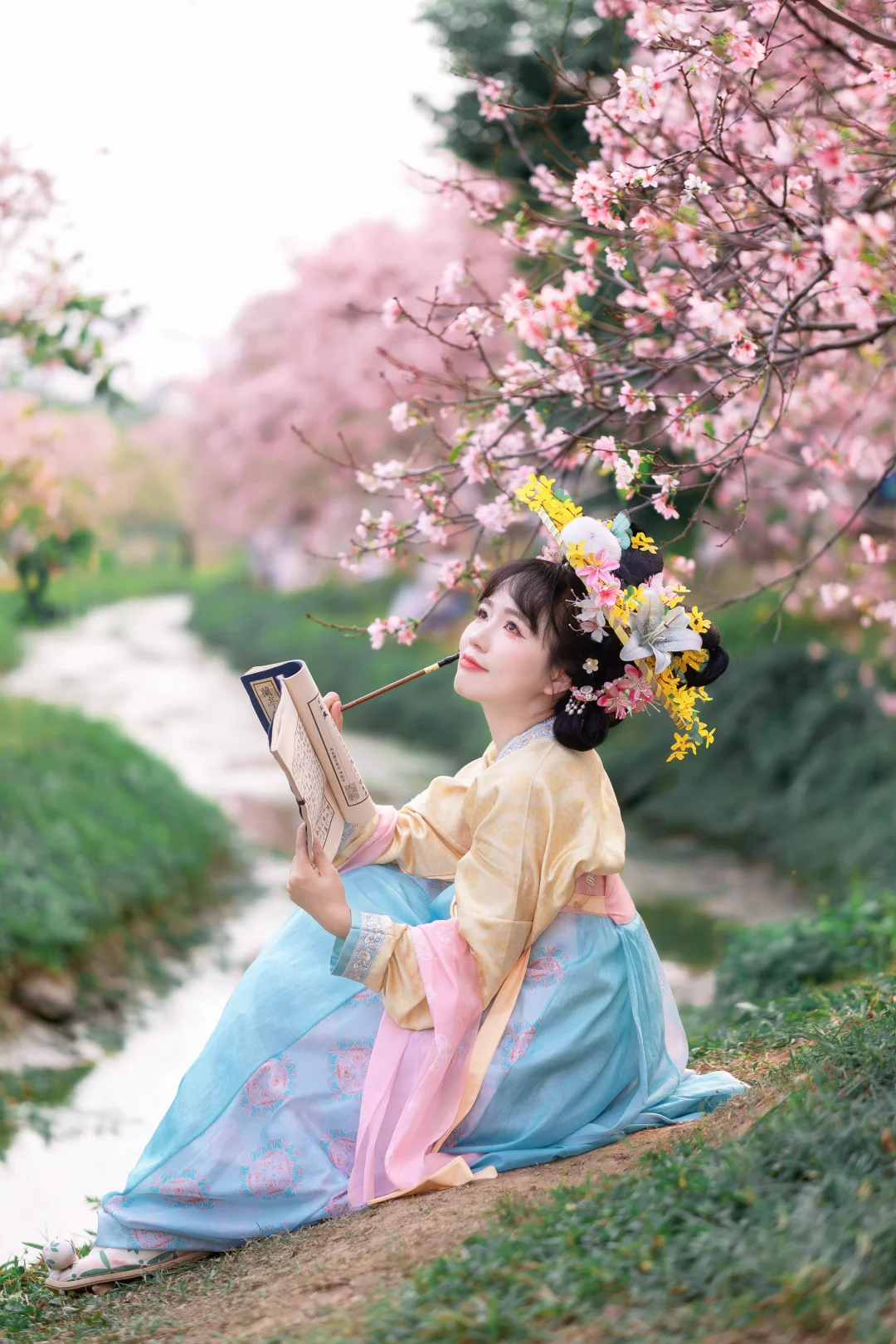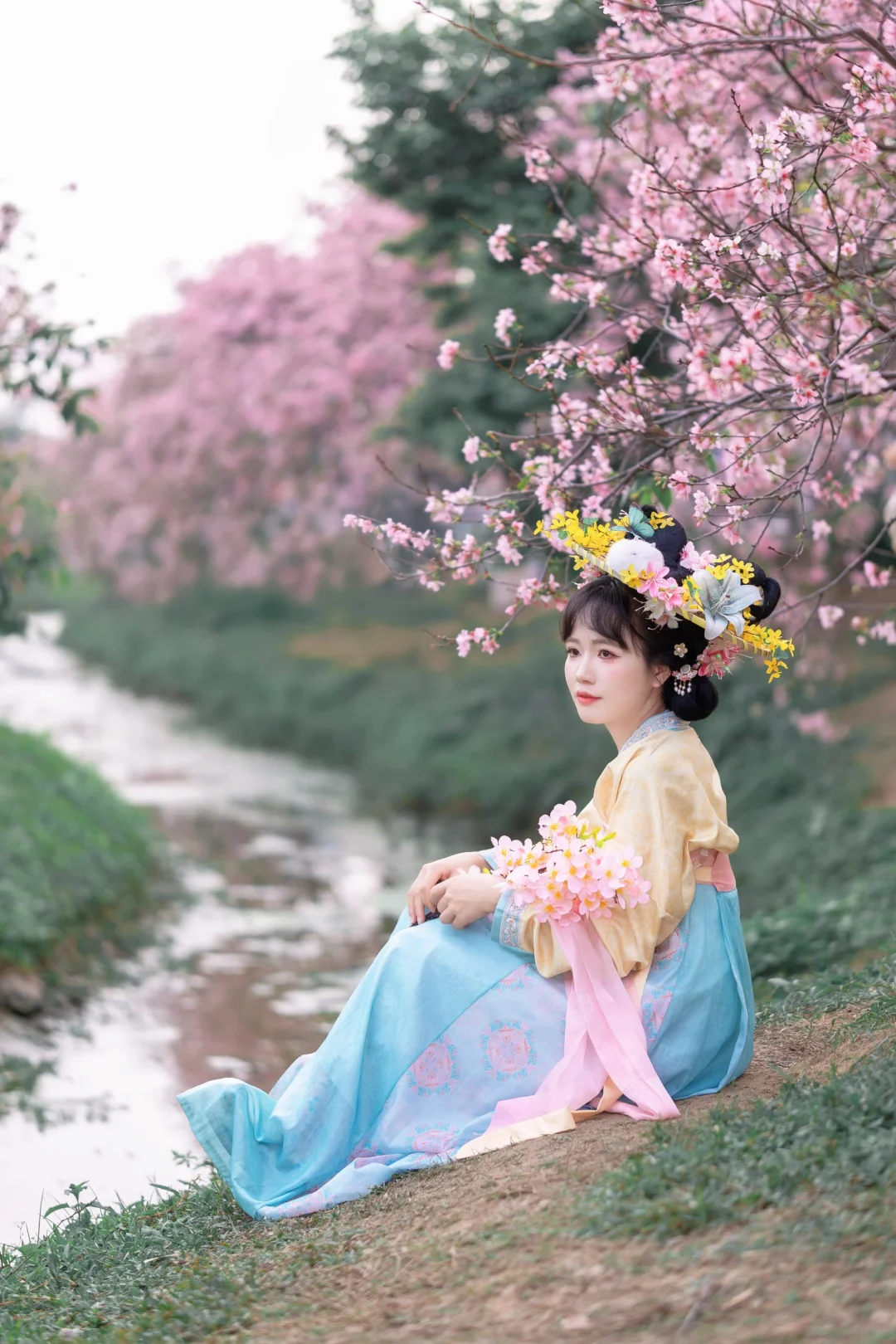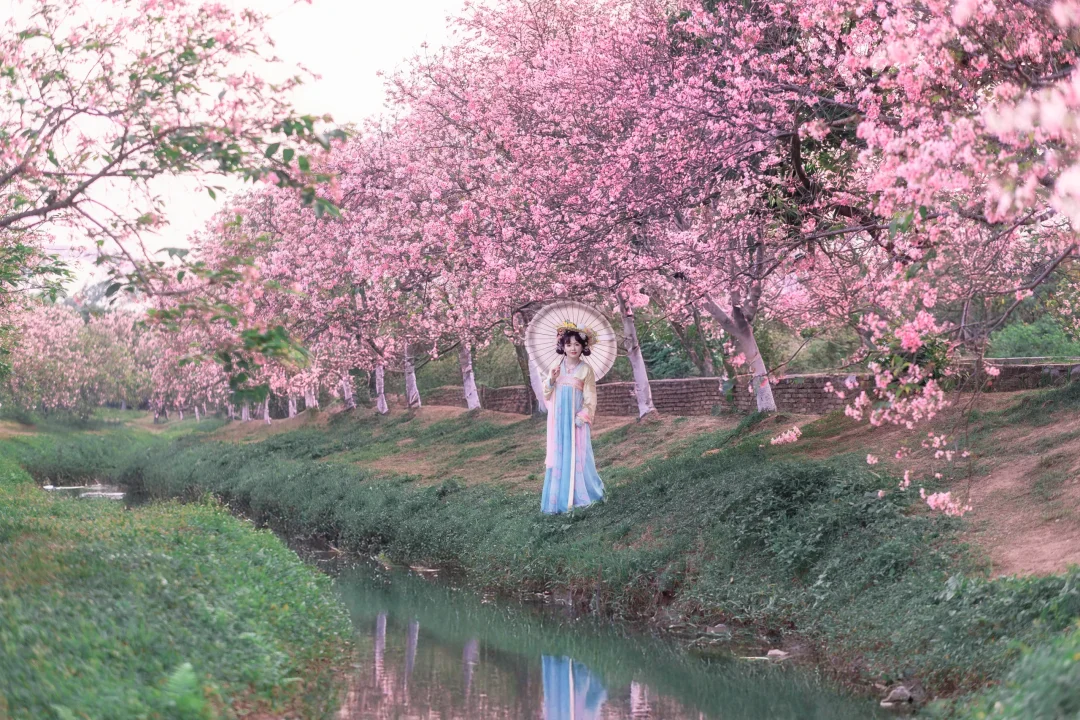 春暖花开, 终于等到广州的樱花开花了,好美; 汉服与樱花的匹配度100%, 坐在河边拍照,这样的景色太喜欢了; 喜欢樱花的,快来赏花吧; 这周应该是观赏期; 📍:广州海珠湿地公园(靠近南门,别从北门进哦);