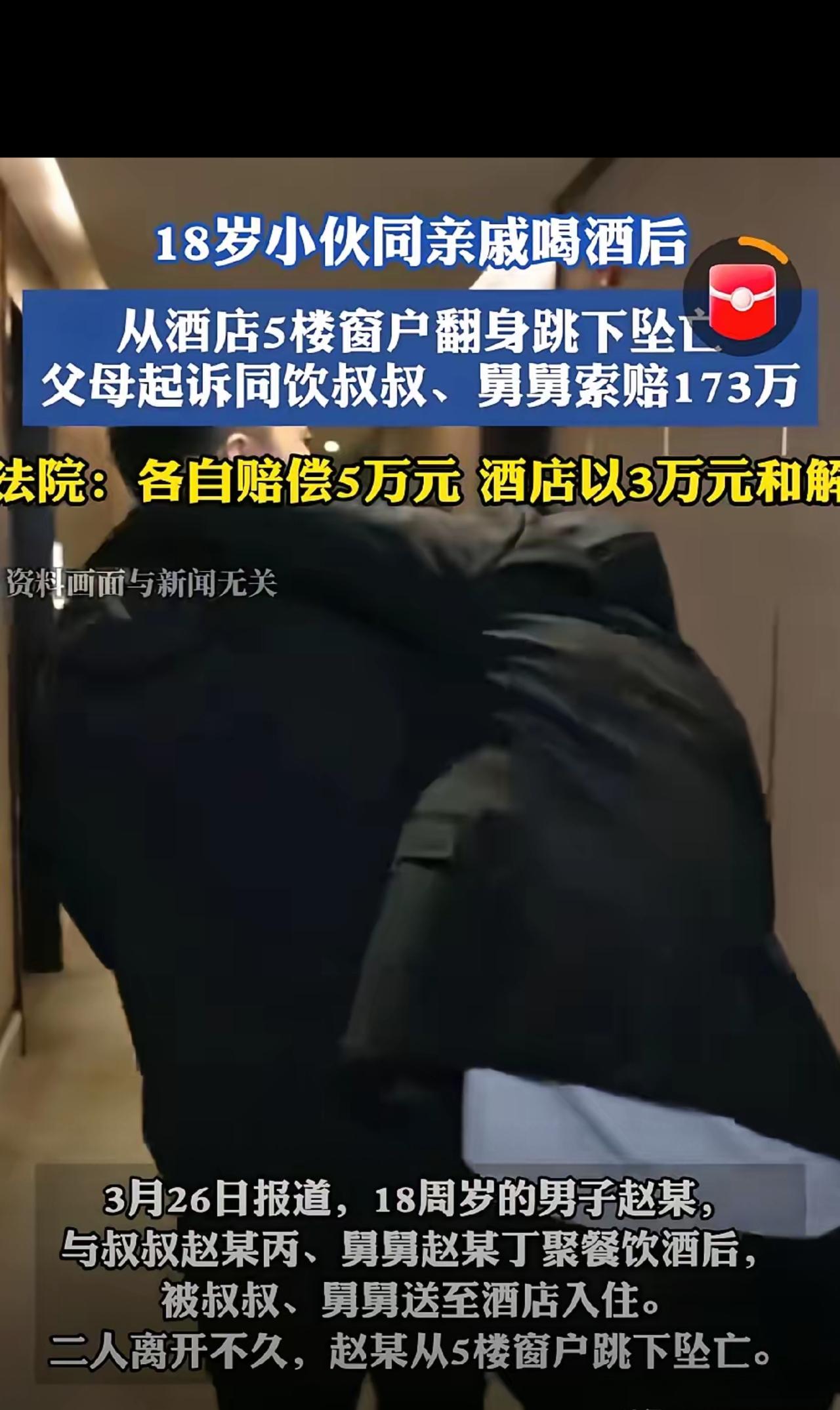 意外还是发生了!广东深圳,18岁的小伙,和自己的叔叔、舅舅一块喝酒,两位长辈看到他有点醉了,就直接给他开了一个房间,把他送到了酒店睡觉醒酒。不料,两人离开后,小伙开门出来,在走廊里敲其他客人房门,后来,竟在酒店5楼的窗户跳下坠亡。小伙父母痛不欲生,怨恨两位长辈没有照顾儿子,将两人告上法庭,要求赔偿各项损失173万元,法院这样判。 刚满18岁的小赵,人生才刚翻开新篇章,本该奔赴美好未来,却因为一顿聚餐、几杯白酒,永远离开了人世,任谁看了都忍不住心疼。 2024年8月的晚上,小赵跟着亲叔叔、亲舅舅,在酒店对面的餐馆小聚,这本是亲戚间联络感情的好事,推杯换盏间,三人喝了3瓶白酒,年轻的小赵没扛住,一人喝了大半瓶,当场醉到神志模糊,只想睡觉。 两位长辈见孩子醉了,倒是没不管,就近在酒店开了间房,把小赵扶进5楼房间,看着孩子躺下就直接离开了,时间是凌晨0点18分。 他们以为开个房让孩子睡一觉醒酒就万事大吉,可危险偏偏在他们离开后爆发了! 监控拍得明明白白:小赵醉得根本睡不安稳,没多久就摇摇晃晃走出房间,在走廊里来回晃悠,还疯了一样敲其他客人的房门,行为怪异到极点。 酒店工作人员发现后,赶紧把他拉回房间,可短短几十分钟后,小赵还是从5楼走廊窗户纵身跳下,当场殒命。 噩耗传来,小赵父母直接崩溃,白发人送黑发人的痛,换谁都承受不住!他们认定,一起喝酒的叔叔舅舅,还有酒店,都要为儿子的死负责,一纸诉状索赔173万! 后续酒店和家属调解,赔了3万了事,而两位长辈却觉得自己比窦娥还冤: “他都18岁成年了,是完全民事行为能力人,自己喝醉酒跳楼,是他自己的选择,我们好心开房让他醒酒,凭啥要我们赔钱?” 这事传到网上,网友直接吵翻了,两方观点针锋相对: ✅网友力挺长辈: “18岁已经是大人了,该为自己的行为负责,跳楼是自己的选择,长辈已经仁至义尽,开房安置了,赔5万太冤了!” ❌网友指责长辈: “亏还是亲叔叔亲舅舅!明知道孩子喝到大醉,意识都不清醒了,敢直接丢在酒店自己走?但凡留一个人照看,或者通知孩子父母过来,能出这事?一点责任心都没有,赔5万都少了!” 法院最终的判决,也给了所有人答案: 小赵已成年,明知醉酒危险还过量饮酒,主动跳楼是悲剧主因,自行承担主要责任; 但两位长辈作为共饮者,更是至亲长辈,明知小赵醉酒失控,却未履行照看义务,既不留守陪护,也不联系家属,存在明显过错,需承担相应赔偿责任,最终判两人各赔5万,共计10万。 说说我的看法: 我觉得这5万赔得一点不冤! 18岁虽说法律上成年了,但刚走出校门,心智远没成熟,喝到行为失常的程度,根本没有自我保护能力。作为亲长辈,不是简单“安置”就够了,共饮就有照看的义务,这不是道德绑架,是最基本的人情和责任。 但凡多上点心,打个电话给孩子父母,或者留下来陪一会儿,悲剧完全能避免。钱赔了还能挣,好好的亲戚没了,一条年轻的生命没了,这辈子心里的坎都过不去。 真的要警醒所有人:酒局不是小事,共饮必有责任! 不管是亲戚朋友,只要有人喝醉酒,千万别嫌麻烦,要么送回家交给家人,要么留人全程陪护,别抱有任何侥幸心理,一旦出事,后悔都来不及! 换做是你,觉得两位长辈该赔吗?这钱到底冤不冤?评论区留下你的看法!