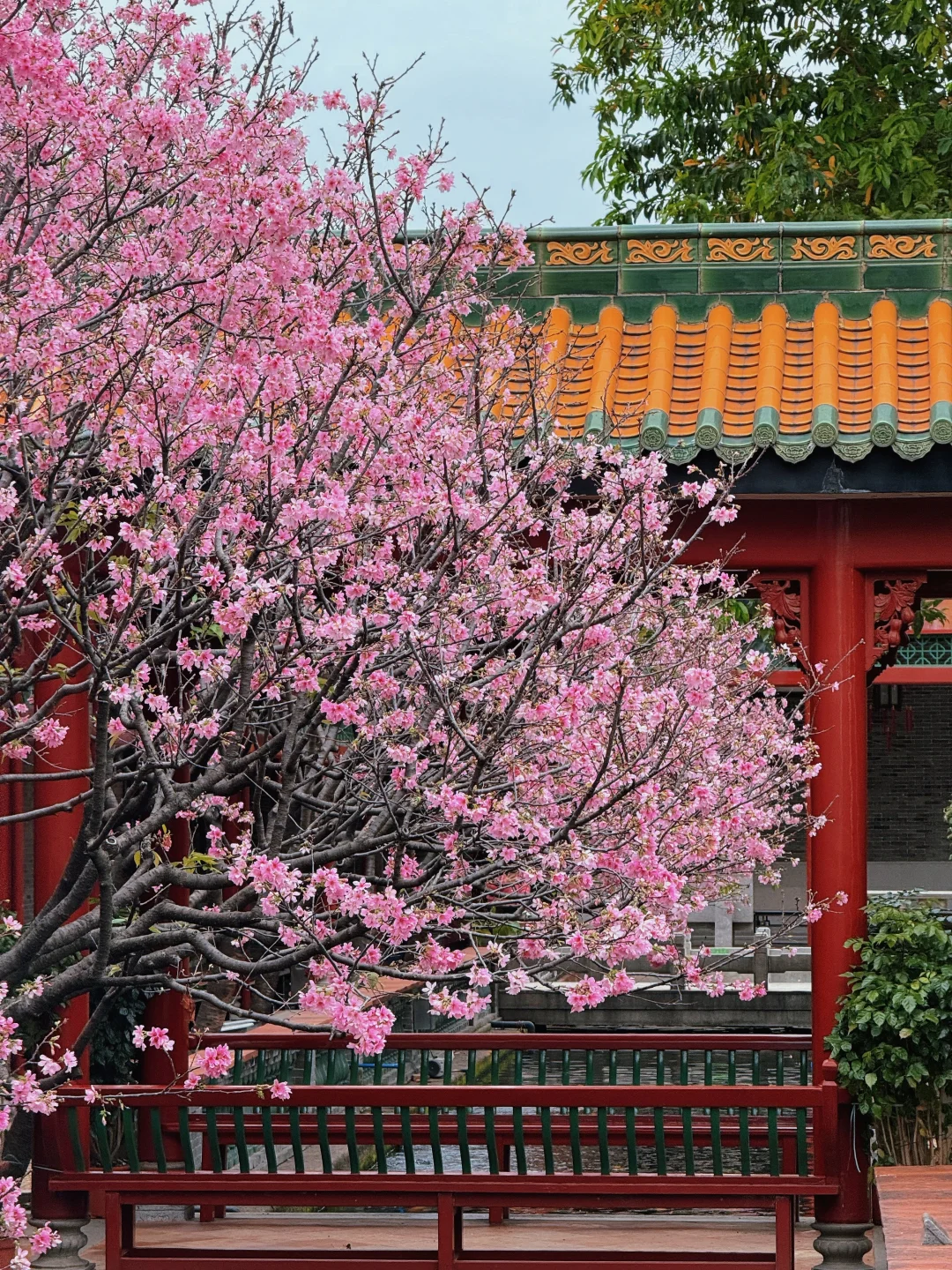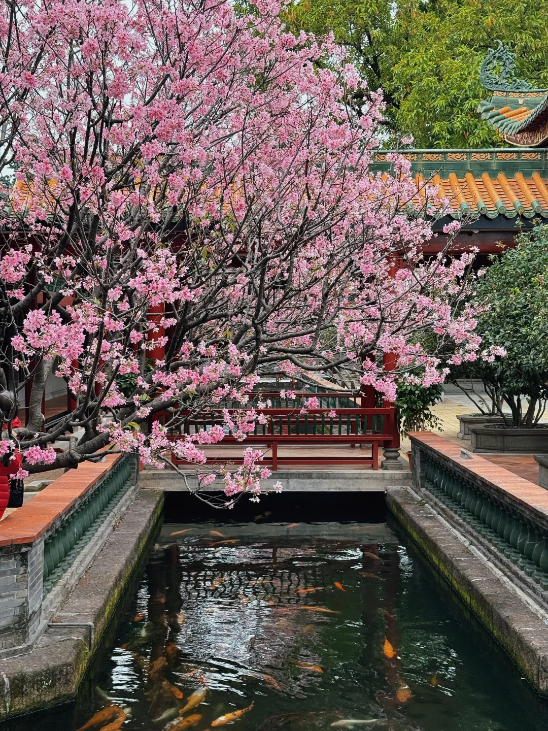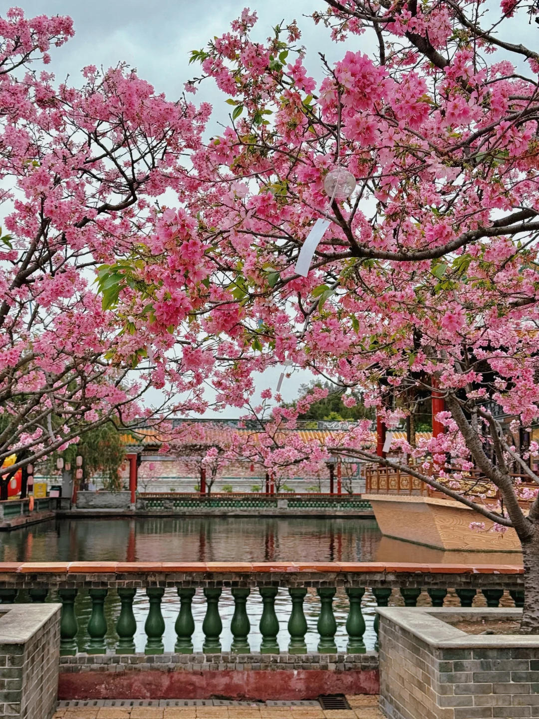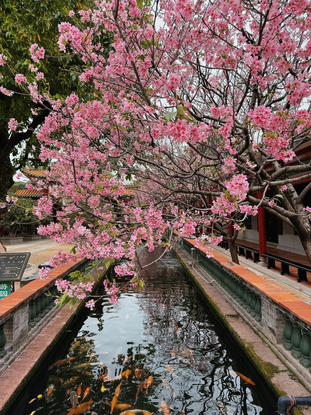 当飞檐黛瓦遇上满树粉樱🌸锦鲤游过湖面