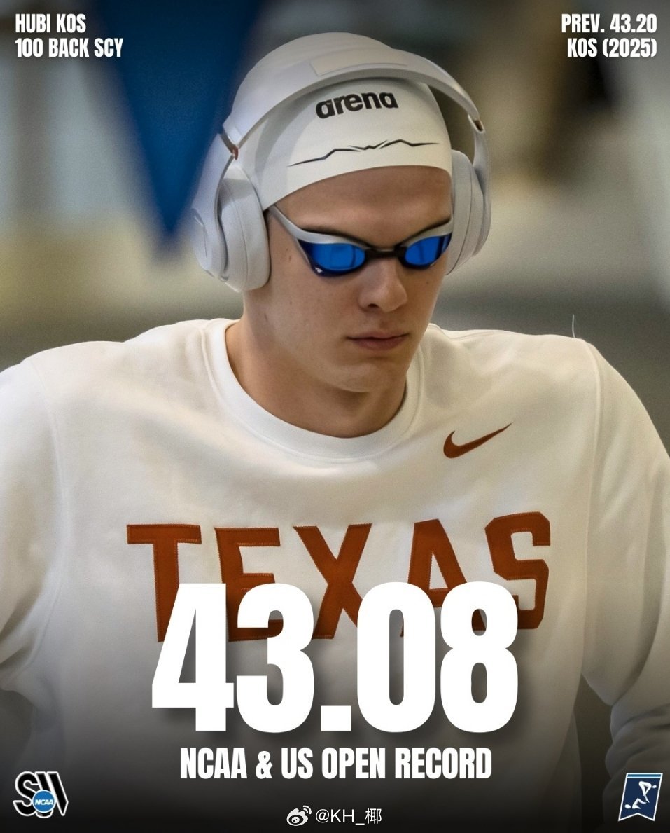 NCAA DI Men's Championships 男100仰预赛,Hubert Kos 43.08预赛就打破自己保持的NCAA纪录和全美公开纪录!