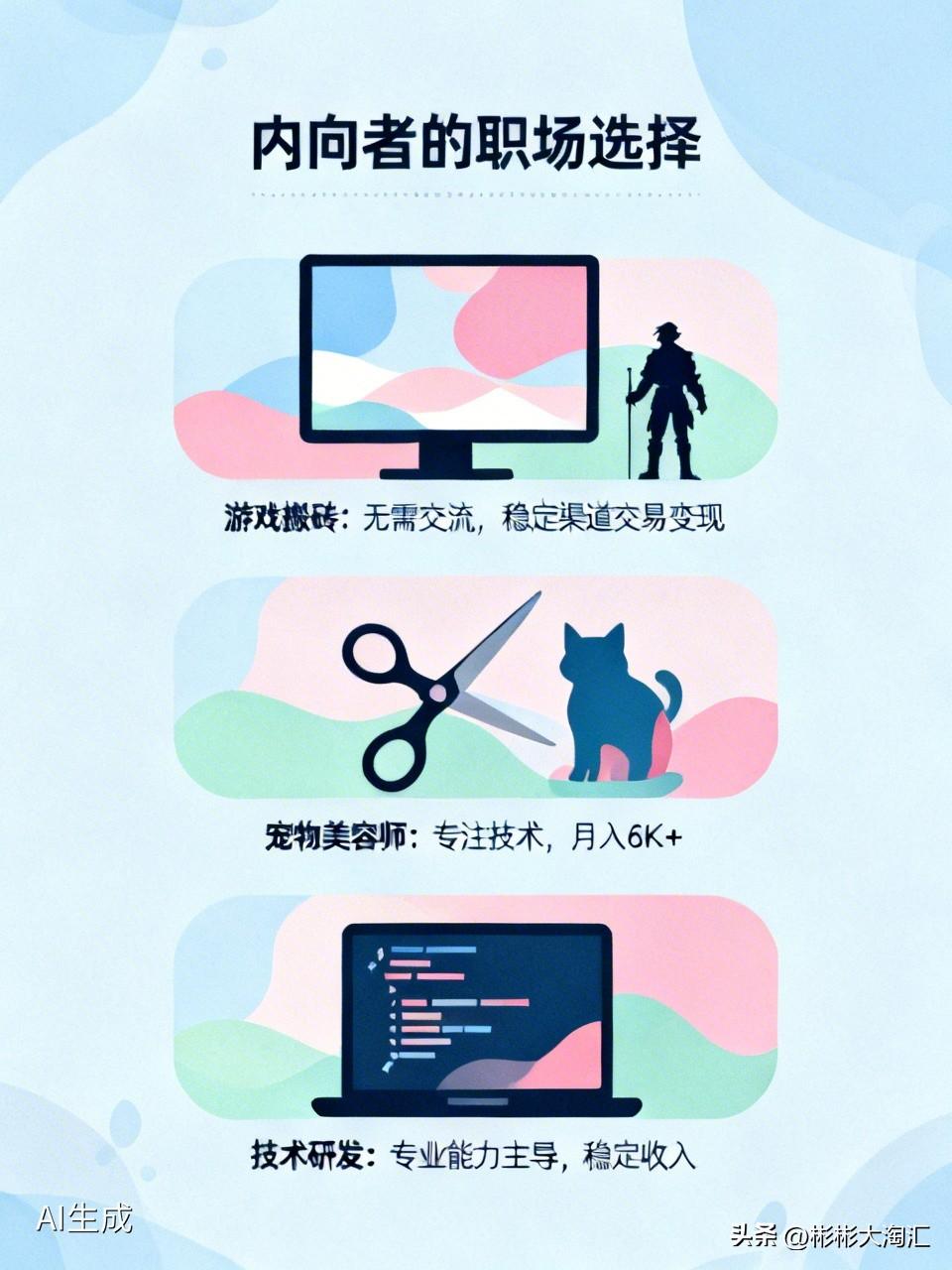 内向的人在职场别焦虑,有很多适合的工作。 像游戏搬砖,操作多个账号打副本、采集制作道具,过程无需交流,渠道稳定的话,交易变现也没多少交流成本,单干不稳还能在U客直谈等平台找前辈或工作室,做好了月入5 - 8K。 宠物美容师也不错,整天和猫猫狗狗打交道,主要是手上功夫,给它们洗澡、剪毛、做造型,技术熟练后月入6K以上。 技术研发类工作更是内向者的“天选”,程序员、软件工程师等,靠专业能力说话,不用频繁社交,内向者专注力强,能沉浸其中打磨成果,薪资还普遍偏高。