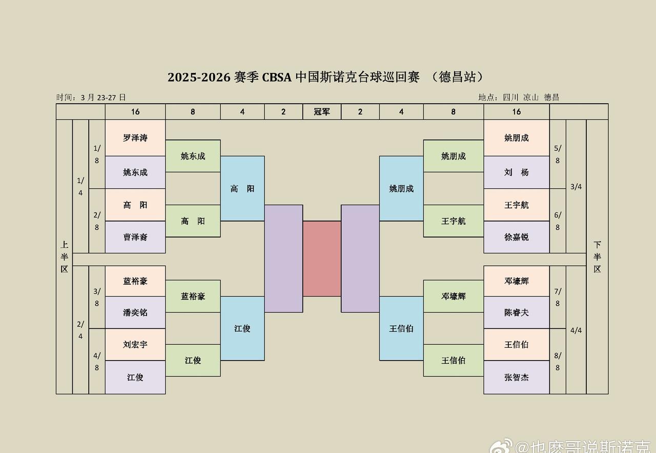 赛事信息:2025-2026中巡赛德昌站8进4比赛 2025-2026中巡赛德昌站,今日晚间进行了8进4的4场比赛,结果王信伯、 高阳、 江俊、姚朋成晋级半决赛。明天(27日) ​​​​10:00将进行两场半决赛,15点进行决赛。 ​​​
