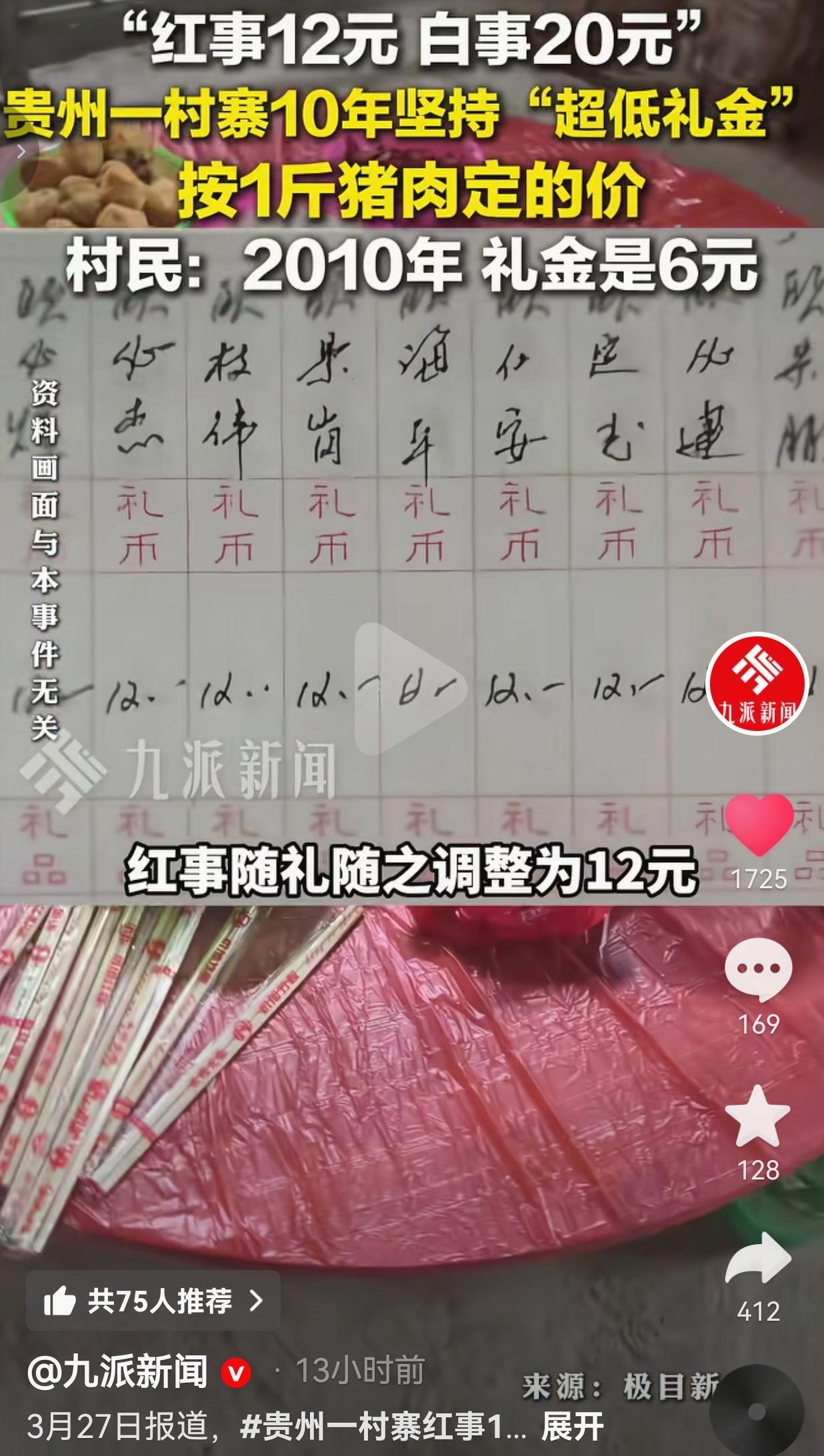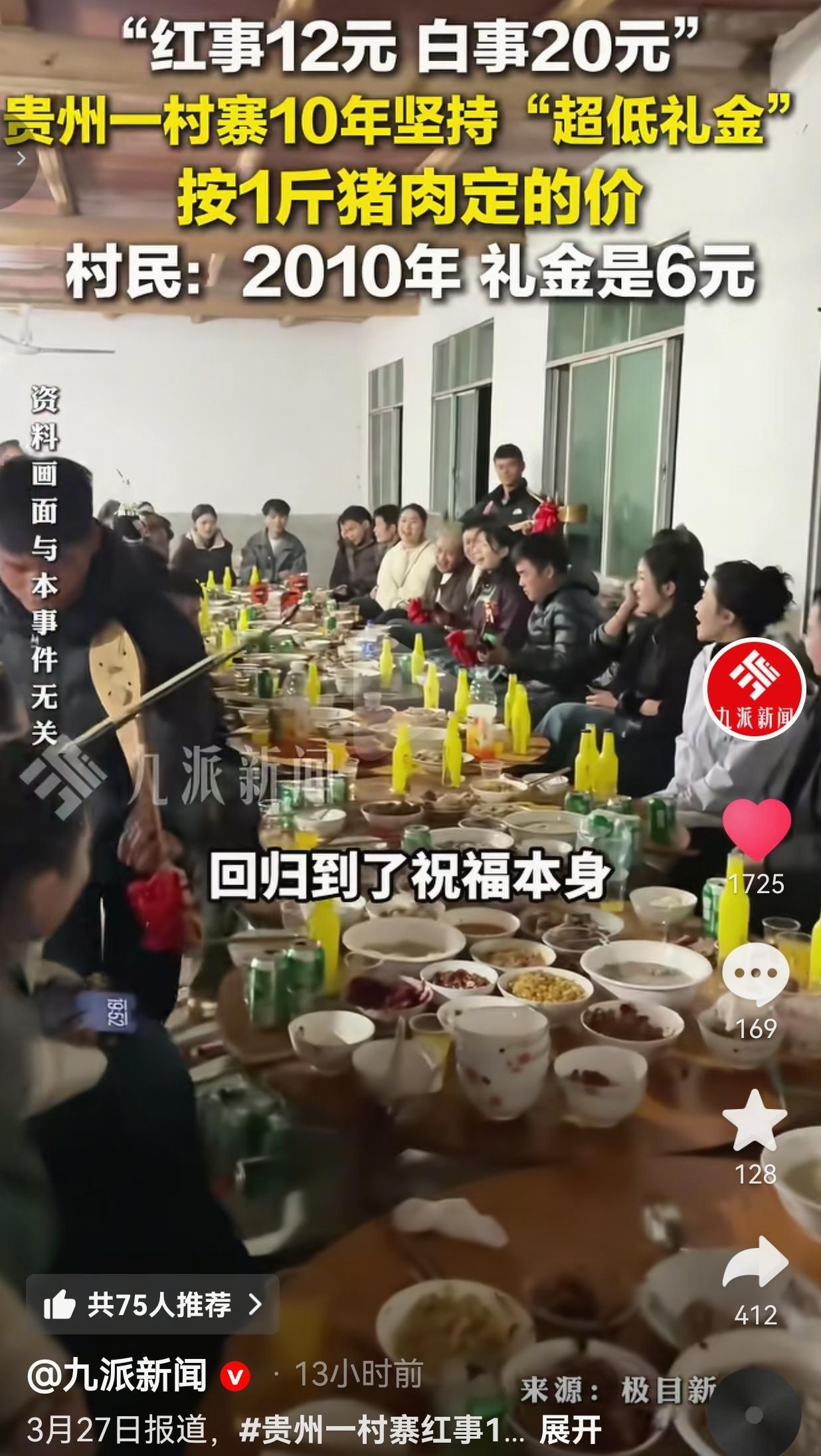 红事12块白事20块!贵州这个村寨把“人情债”撕得稀碎,看完我哭了! 你敢相信吗?现在还有随礼只给12块、20块的地方?!贵州这个侗族村寨,把被城里人玩坏的“人情世故”,硬生生拉回了最朴素的模样。 2010年,这个村子开了场村民大会,拍板定下一条死规矩:红事随礼就按1斤猪肉的价,白事就按当时猪肉最高价! 那时候猪肉6块钱一斤,红事礼金就定6块;后来猪肉涨了,红事跟着调到12块,白事直接按最高价定20块。这规矩一守就是10多年,谁都不能破,谁破谁被全村戳脊梁骨。 你去城里吃个酒,随个200都拿不出手,关系好点的500、1000往上堆,随礼随得钱包滴血,吃席吃得心惊胆战——生怕下次人家回礼少了,心里还得膈应半天。 可在这个村子里,红事12块,白事20块,你揣着几十块钱就能大大方方走进那间摆着长桌、飘着菜香的屋子,不用算人情账,不用怕欠人情,坐下来就吃肉喝酒,听着旁边人弹着乐器唱着歌,热热闹闹的,那才叫“喜事”,那才叫“帮忙”! 你看那满桌的碗碟,冒着热气的菜,黄澄澄的饮料瓶摆得整整齐齐,老老少少围坐在一起,有人举着手机记录热闹,有人跟着调子哼歌,没有谁在偷偷算“我随了多少你回了多少”,没有谁在攀比谁的礼金更厚——这里的酒席,从来不是为了敛财,就是为了把邻里们凑到一起,把祝福说出口,把情义暖在心里。 网友看到后评论说:“我上次随礼随了800,结果人家回了500,我气了半个月!要是都像这村子这样,谁还怕吃席啊!” 也有的网友说:“我们那随礼都卷到1000起了,刚毕业的年轻人随一次礼,半个月工资没了!这才是真正的‘移风易俗’!” 还有的网友说:“白事20块?我家这边白事都得随500起步,还得买花圈买贡品,穷人都死不起了!这村子才是有人情味!” 也有的网友说:“以前随礼是心意,现在随礼是生意!这村子把‘心意’找回来了,太戳人了!” 我们现在的红白喜事,早就变味了:红事成了敛财的由头,白事成了攀比的舞台,随礼随的不是祝福,是“面子”和“债务”。 你随少了,别人说你抠门;你随多了,自己日子过不下去。多少年轻人因为怕随礼,连老家的酒席都不敢回?多少家庭因为随礼,把日子过得紧巴巴? 可这个村子偏偏反其道而行之!他们用最朴素的方式告诉我们:人情不是买卖,祝福不该标价。 12块钱,买的不是一顿饭,是“我来给你道喜”的心意;20块钱,给的不是份子钱,是“我来帮你撑场面”的情义。 你看那满屋子的笑脸,那冒着热气的饭菜,那弹着乐器的身影——这才是中国人最本真的样子:不攀比、不算计,热热闹闹,互帮互助,把邻里间的情谊,完完整整回归到了祝福本身。 什么叫“移风易俗”?不是喊口号,不是发文件,是像这个村子一样,把被金钱污染的人情,拉回泥土里,拉回烟火气里,拉回那桌热饭、那声祝福里。 最后,我想说的是:最贵的从来不是礼金,是愿意坐下来陪你吃一顿热饭的真心。 对此,你怎么看?