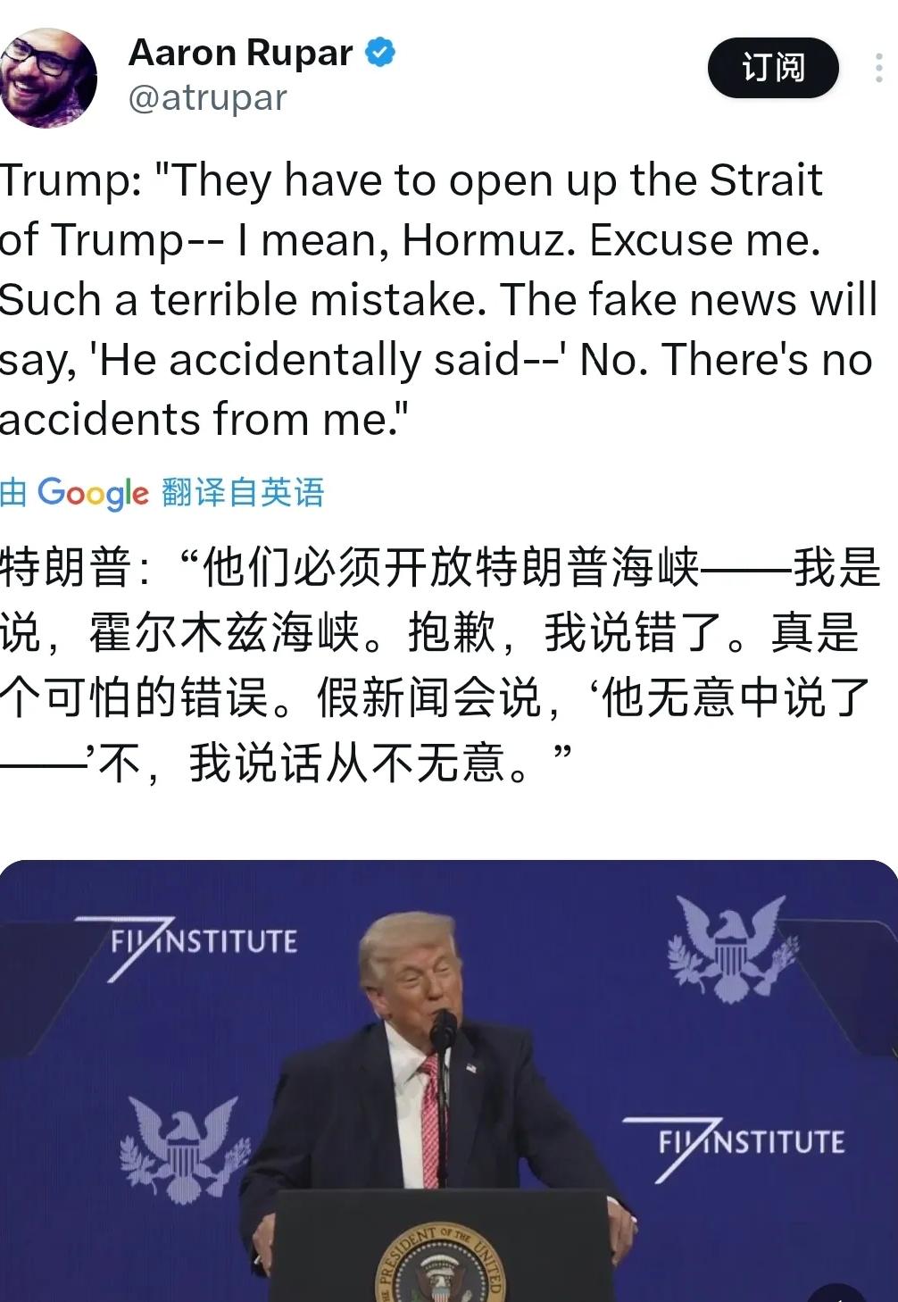2026年3月28日,美国总统特朗普在一场公开演讲中脱口而出:“他们必须打开‘特朗普海峡’——我是说,霍尔木兹海峡。抱歉,我犯了个可怕的错误。假新闻会说:‘他不小心说错了——’不,我从不会出这种差错。” 这番略显荒唐的话语立刻引发关注,而后,他轻描淡写地把这当作一次玩笑,却没忘补上一句自己从不会犯错。 霍尔木兹海峡,是全球能源命脉的重要枢纽,每天成百上千艘油轮穿梭其间,一旦局势动荡,这座海峡的安危会牵动世界经济。 特朗普居然用自己的名字去“接管”这一国际要道——哪怕是在玩笑之中,多少让人感受到属于他特有的自负和试探。他谈吐中的轻佻暗藏着深深的政治意味,不仅是个人自大,也是美国霸权态度的缩影。 其实,在国际舞台上,特朗普多次用类似插科打诨的方式表达自己的意图。他喜欢把全球重大议题当成个人秀场,用一句话试探反应,用夸张手法换取掌声,只为巩固自己的影响力。 面对全球都关心的霍尔木兹海峡问题,他竟以一句“特朗普海峡”来调侃,显然不是无心之失。 看似无害的幽默,背后却是把自己的愿望凌驾于国际规则之上,对历史和现实的无视。 这种做派不仅不尊重他国,更搅动国际舆论,让本就复杂的地缘局势增加变数。 在特朗普看来,世界关键事务可以被个人化、商品化、甚至沦为选举筹码。 他是把全球安危当成了私人的舞台,甚至有些得意地觉得只要自己开口,霍尔木兹也能“改姓”。这实在让人担忧倘若此类思维贯穿外交政策,全球合作恐怕将变成一场推销式演讲。 即便只是嘴上游戏,特朗普的言辞依然折射出美国孤立主义和主导欲望。 当个人野心与国际公约撞车时,结果往往是信誉受损、信任瓦解。霍尔木兹海峡作为跨文化、跨国界的通道,不归任何一方所有。 特朗普吹嘘“从不出错”,实际却暴露了霸权主义的傲慢。在这个迅速变化的世界,连全球油阀都成了政客们的表演道具,只能说这种戏码让美国的国际信誉再添几分尴尬。